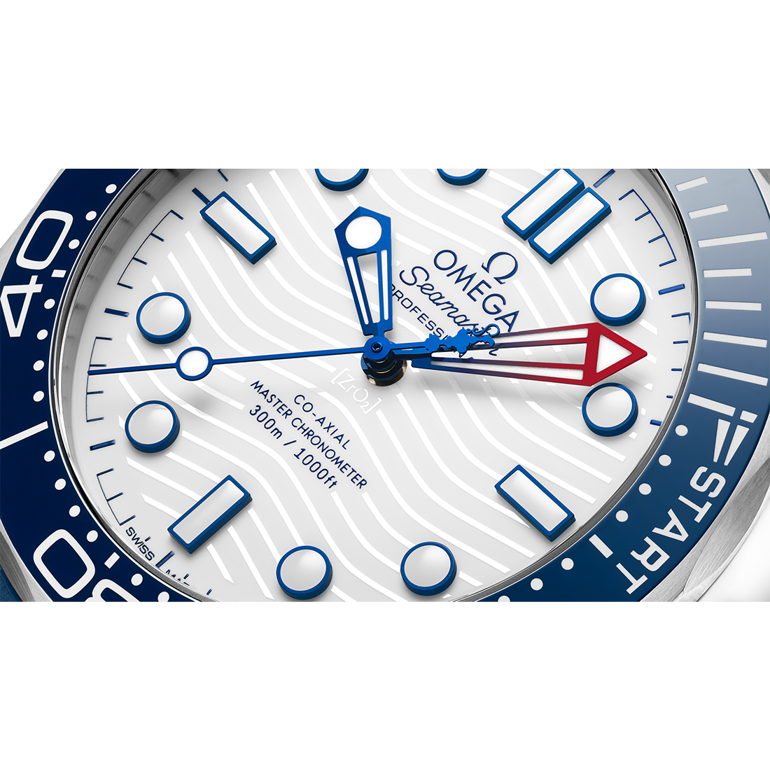 マット仕上げのホワイトセラミック製ダイアルには、レーザーエングレービングで施した立体的な波模様がデザインされています。中央のクロノグラフ秒針のカウンターウェイトには、アメリカズカップのトロフィーが、バルセロナのロゴと同じブルーであしらわれています。