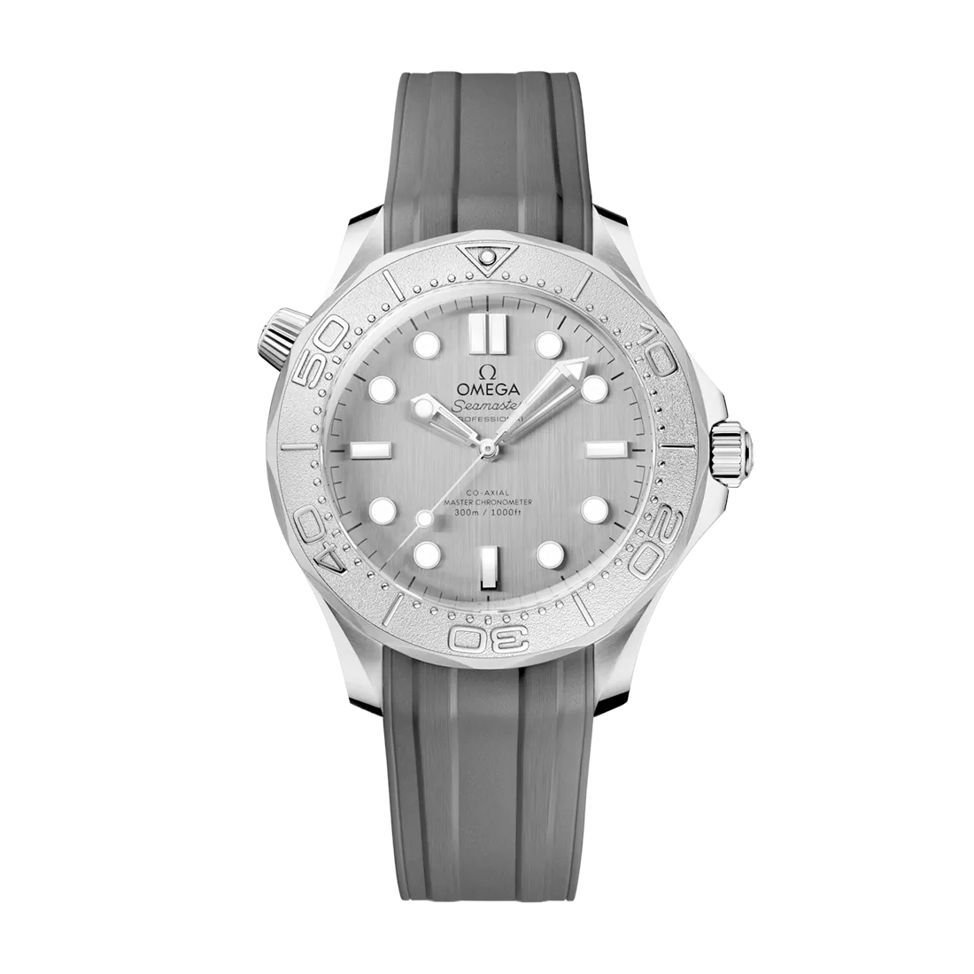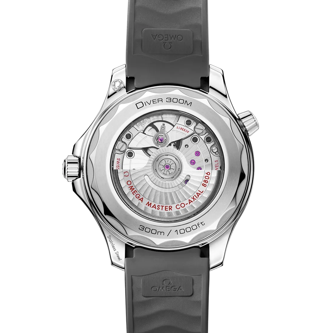 ブラッシュ仕上げのダイアルと、ホワイトスーパールミノヴァが塗布されたポリッシュ仕上げのスケルトン針およびインデックスには、PVDによるステンレススティールが使用されています。オメガのロゴやその他のマーキングは、ブラックの転写で施されています。