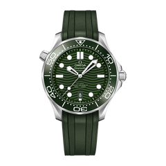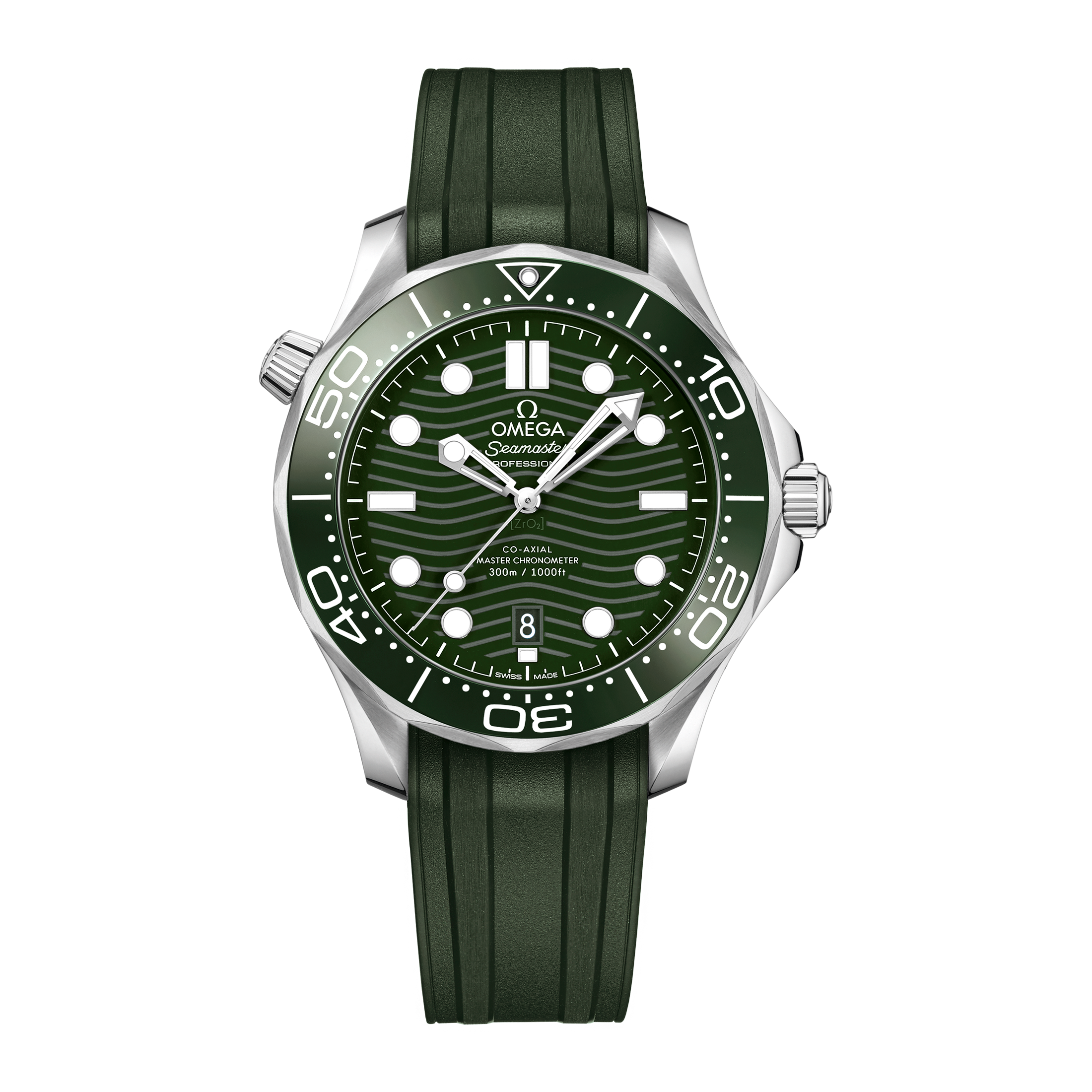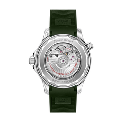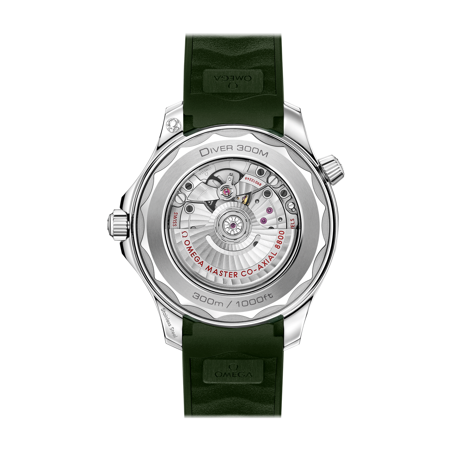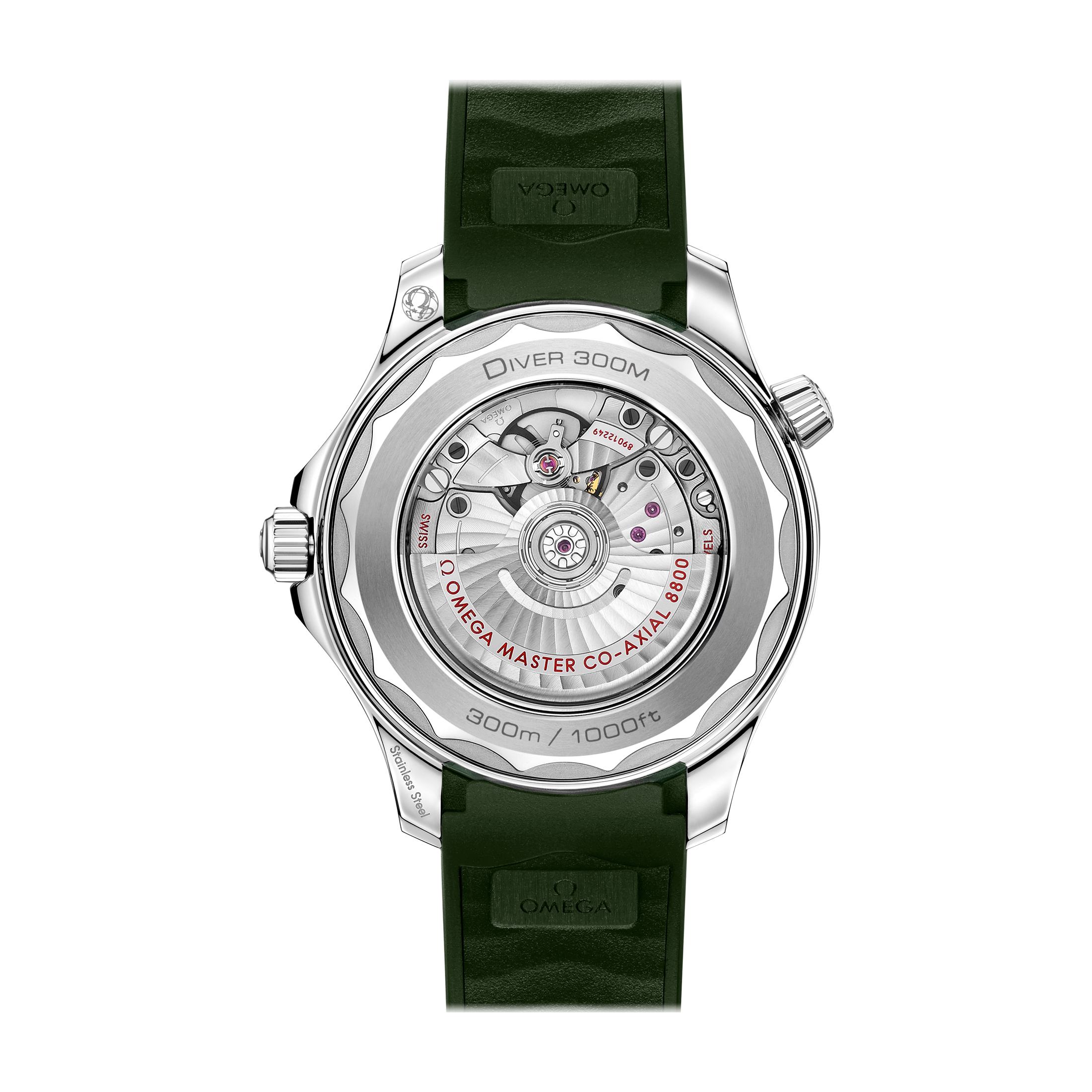グリーンのラバー製ストラップが付属。オメガ マスター クロノメーター キャリバー 8800が搭載され、波模様で縁取られたケースバックのサファイアクリスタルガラス越しに眺めることができます。