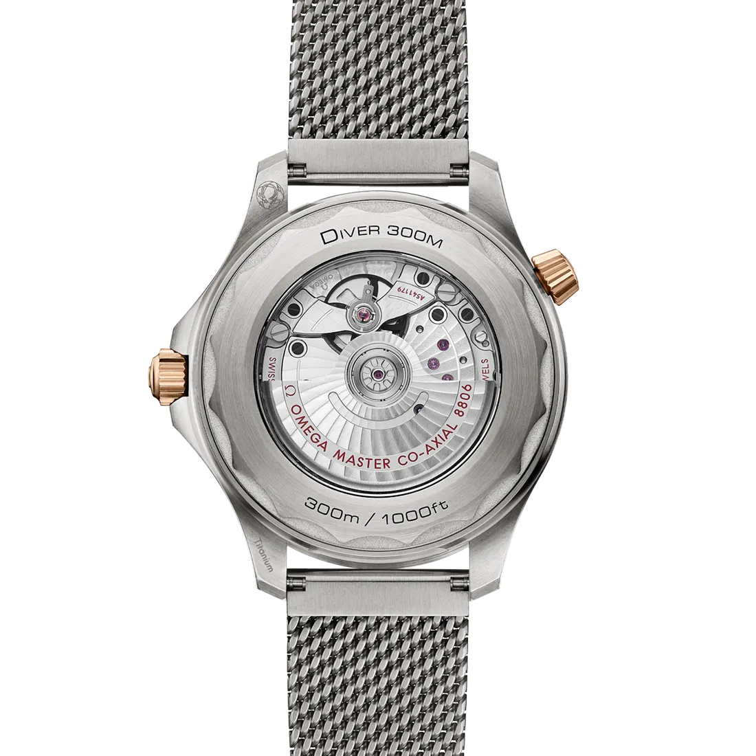 合わせているのは、クラスプされていたメッシュブレスレットです。オメガ コーアクシャル マスター クロノメーター キャリバー 8806 搭載。波模様で縁どられたサファイアクリスタルガラスのケースバックからその姿を眺めることができます。