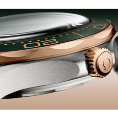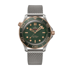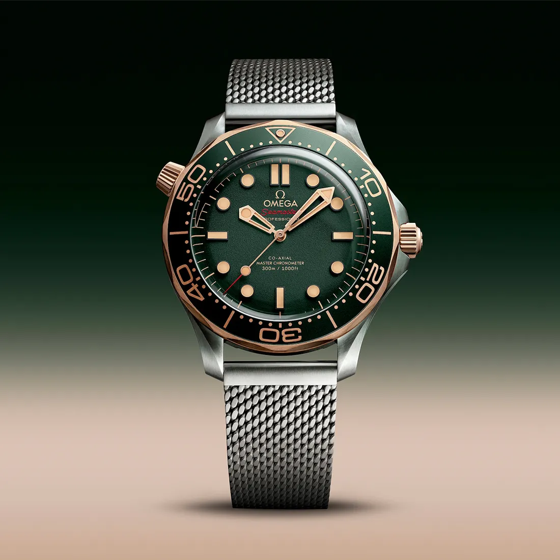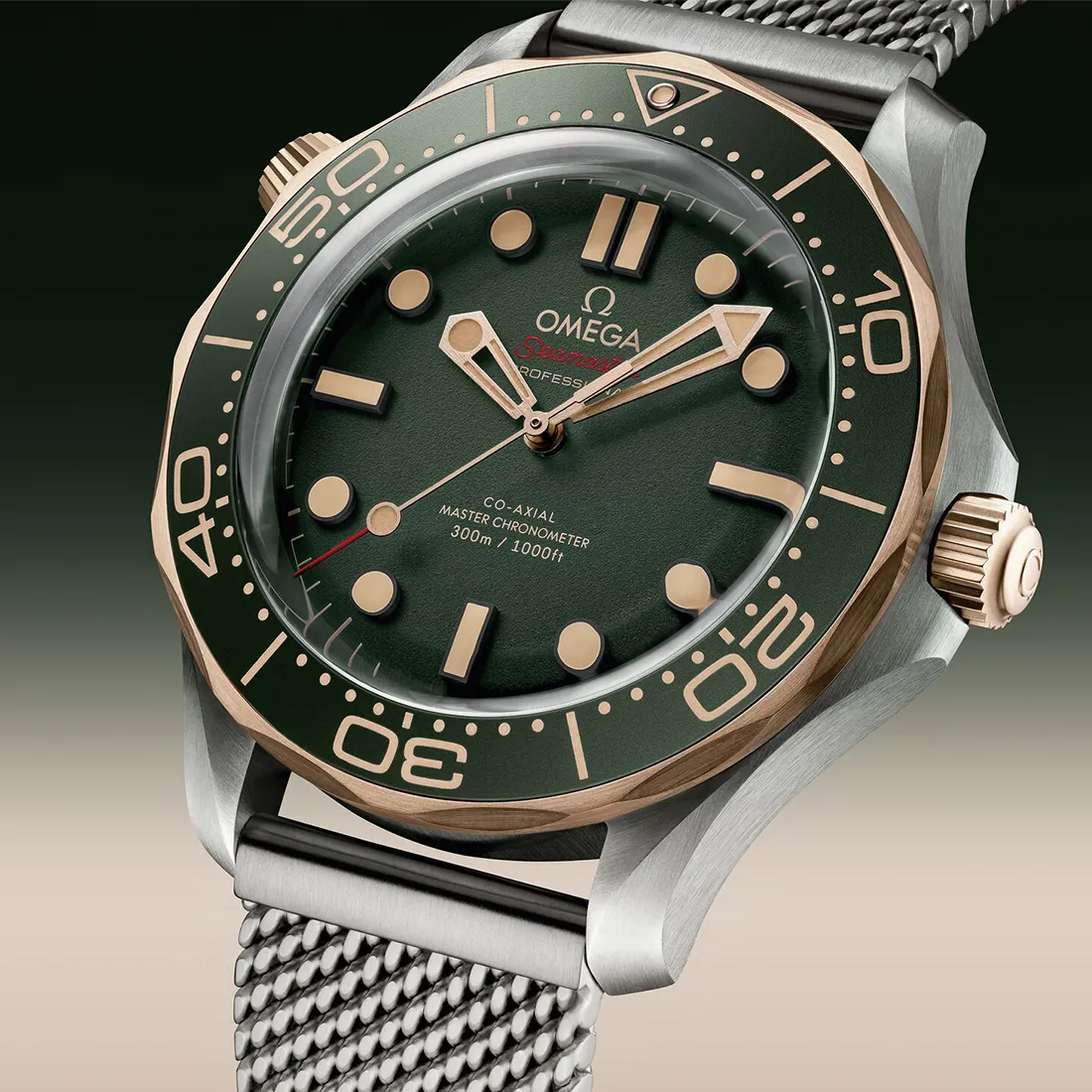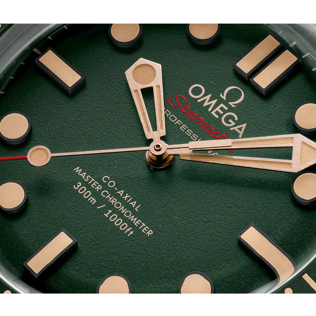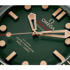 直径42mmのケースのモデルは、グレード2チタン&オメガ独自の9Kブロンズゴールド製です。シュウ酸アルマイト処理を施したグリーンのアルミニウム製ベゼルリングに、ヴィンテージのスーパールミノヴァが塗布されたダイビングスケールを備えていますます。