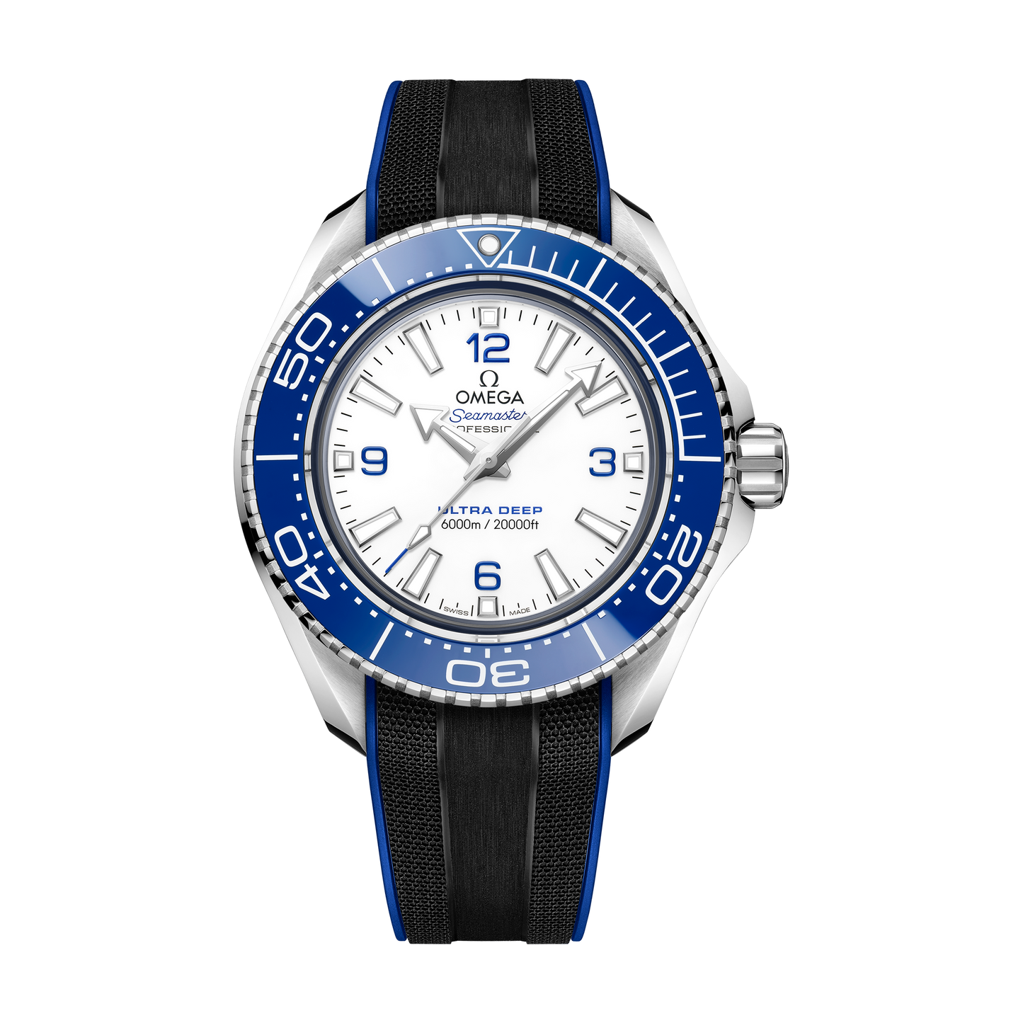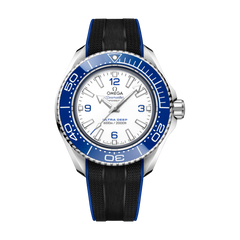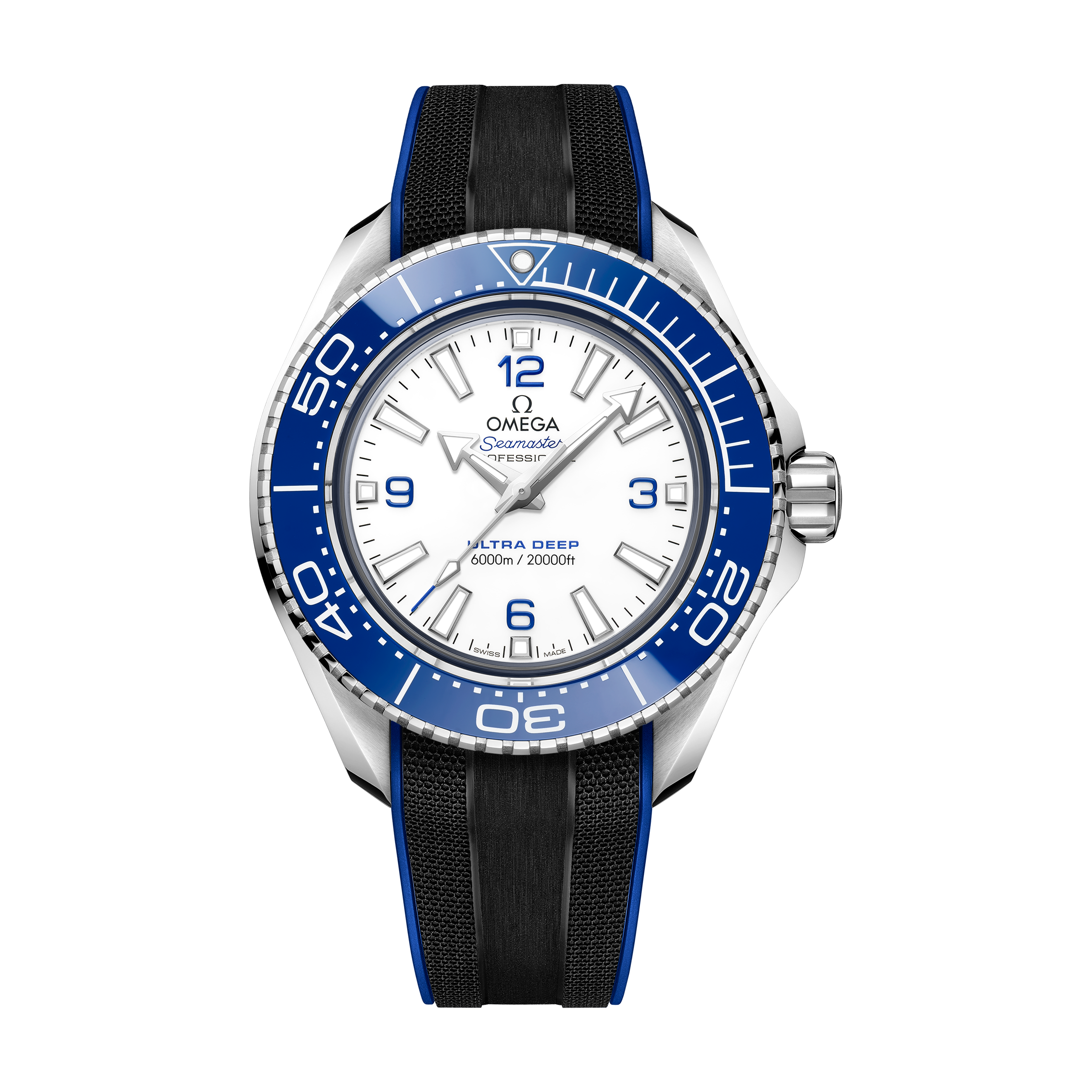 45.5 mmの堅牢なO-MEGASTEEL製モデルは、ポリッシュ仕上げのブルーセラミック製ベゼルと、ホワイトエナメルのダイビングスケールを備えています。盛り上がったドーム型のサファイアクリスタルガラスを通して、ラッカー仕上げのホワイトダイアルには4つのブルーのアラビア数字、18Kホワイトゴールド製の針、インデックスがあしらわれ、いずれにもホワイトのスーパールミノヴァが塗布されています。