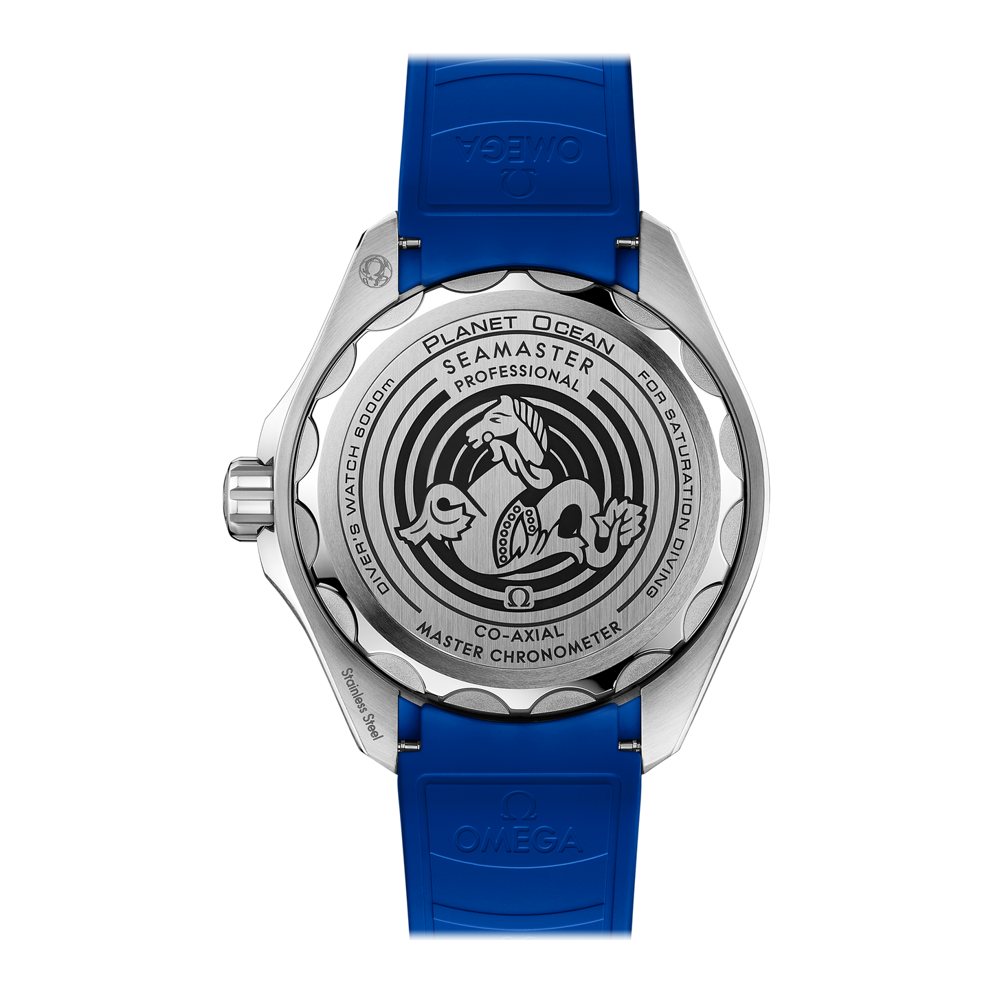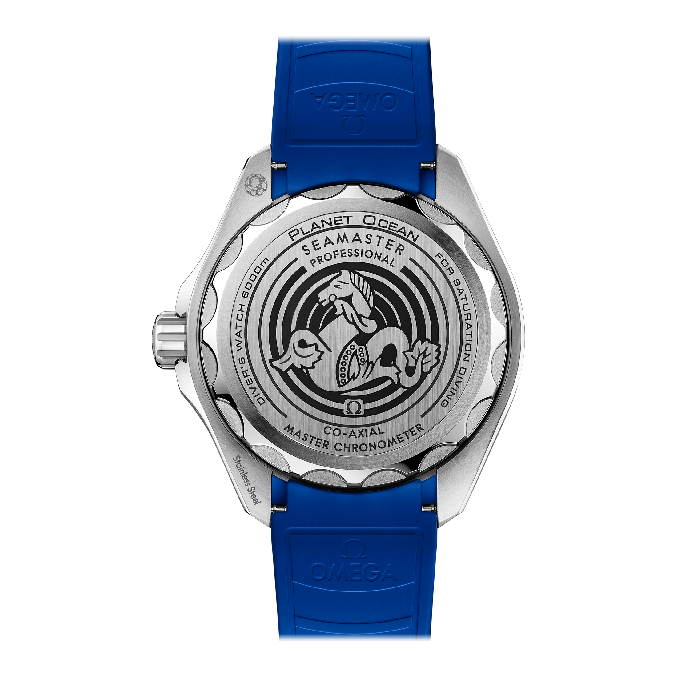 ラバーストラップにはブルーのライニングとO-MEGASTEEL製バックルが備えられ、ケースバックのグレード5チタン製メダリオンには、オメガを象徴する中央のシーホースと共に、ソナーエンブレムがエングレービングで刻印されています。搭載されているムーブメントは、オメガ コーアクシャル マスター クロノメーター キャリバー8912です。