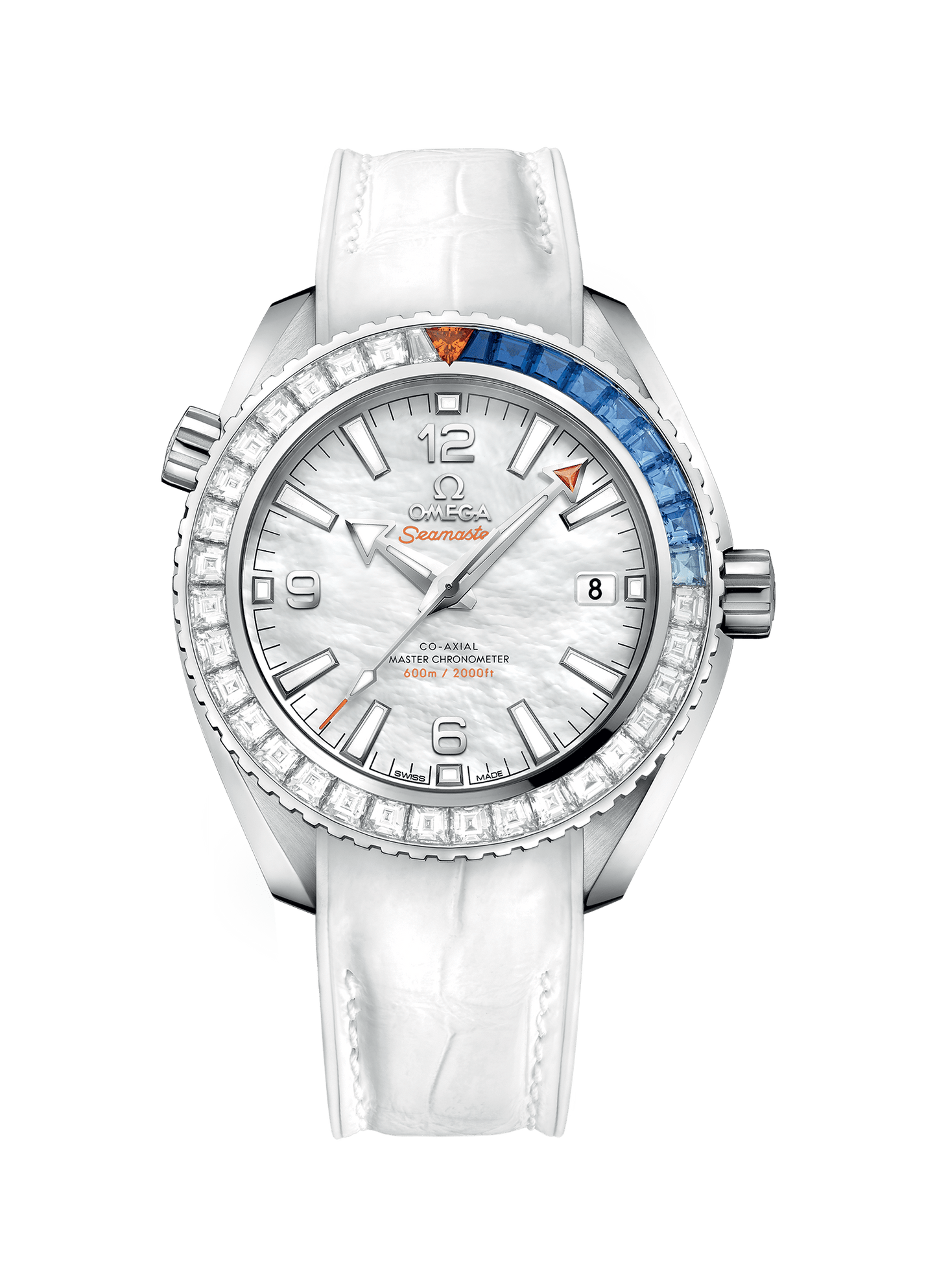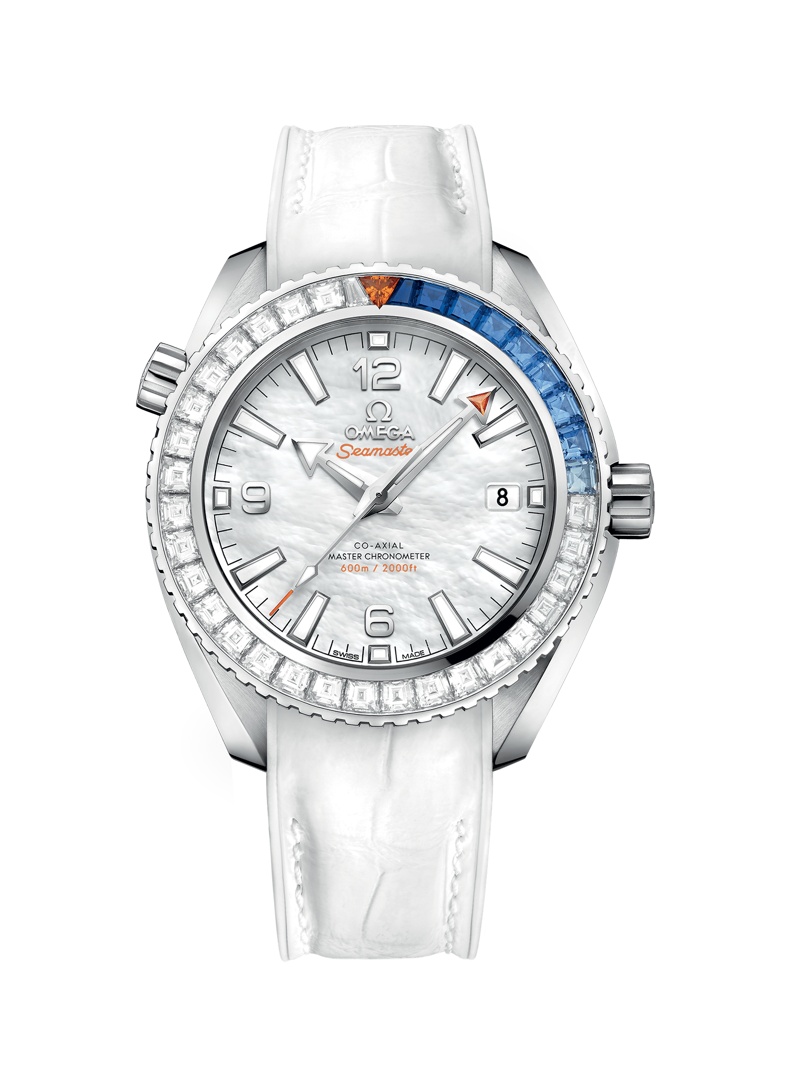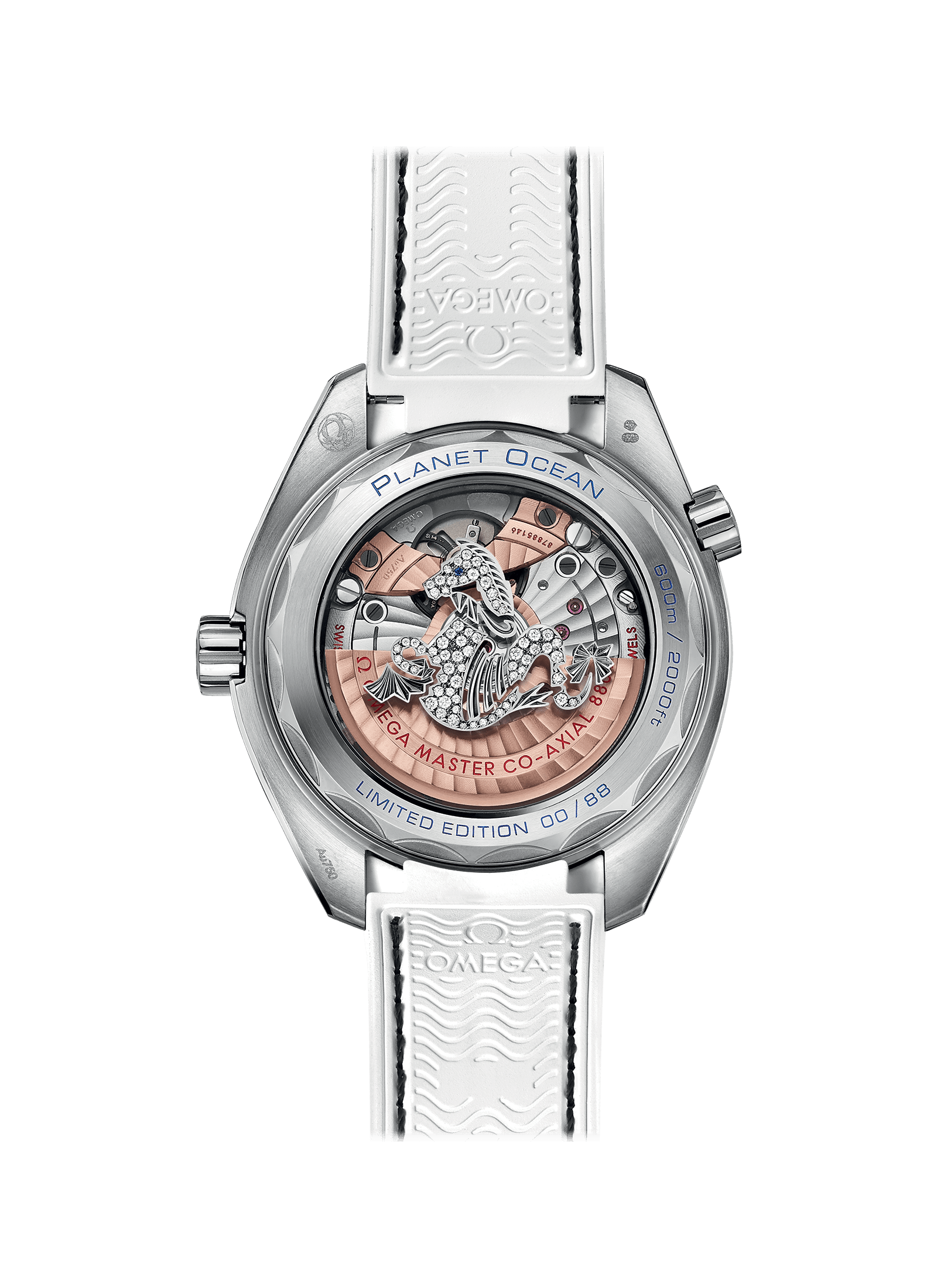 ホワイトマザーオブパールのダイアルには、スーパールミノヴァが塗布された18Kホワイトゴールド製インデックスが付属しています。その他、アラビア数字、3時位置の日付窓、18Kホワイトゴールド製の針が配置されています。また、分針の先端にはオレンジサファイアがセットされ、ケースバックにはダイヤモンドがセットされた手彫りのシーホースが装飾されています。