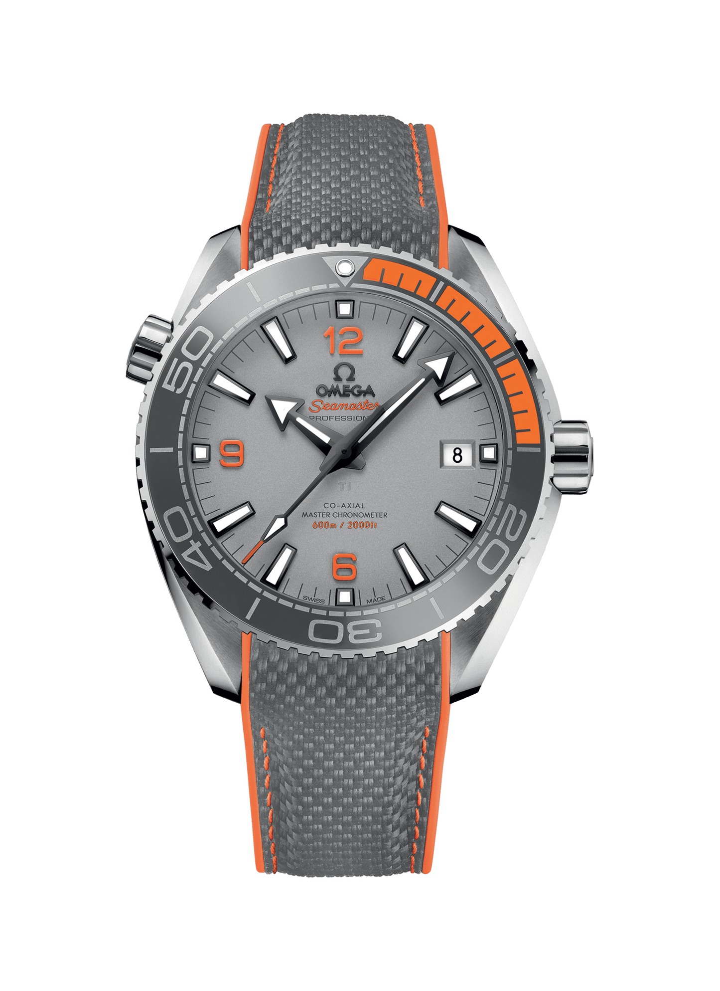 傷の付きにくいサファイア クリスタルガラスを採用。ダイアルは、サンドブラスト仕上げのグレード5チタン製で、アラビア数字表示と3時位置に日付窓を備えています。43.5mmのグレード5チタン製ケースには、世界初の技術によってオレンジのラバーが接合したグレーのシリコンニトライド セラミック製のベゼルが付属しています。ベゼルのダイビングスケールはリキッドメタルR製です。