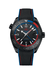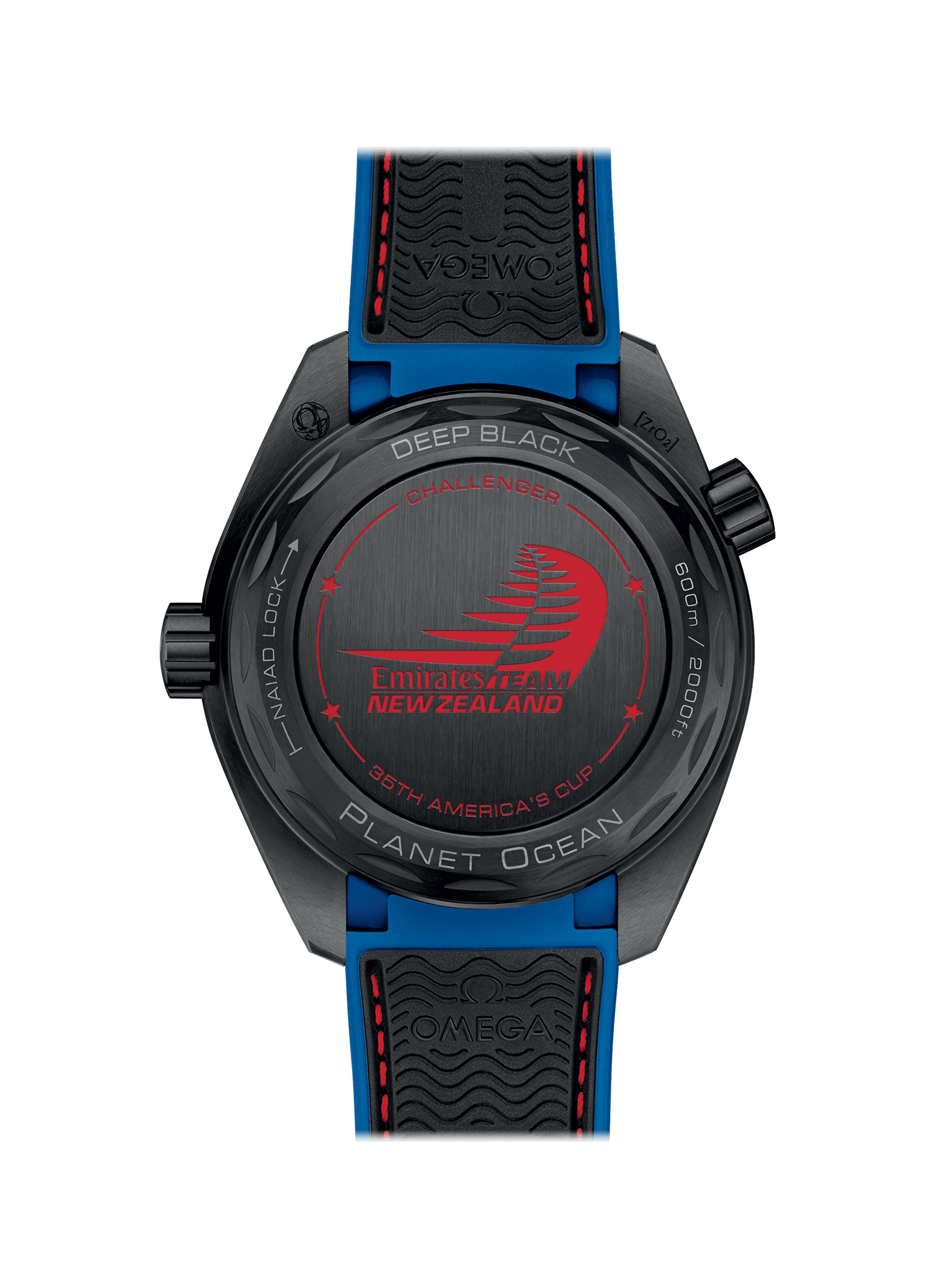 ブラックセラミック製のケースに収められた、レース仕様のモデル。セラミック製ベゼルの最初の10分の部分には、ニュージーランド国旗の色であるブルーとレッドのラバーが埋め込まれており、ダイビングスケールにはオメガ リキッドメタルRが使用されています。