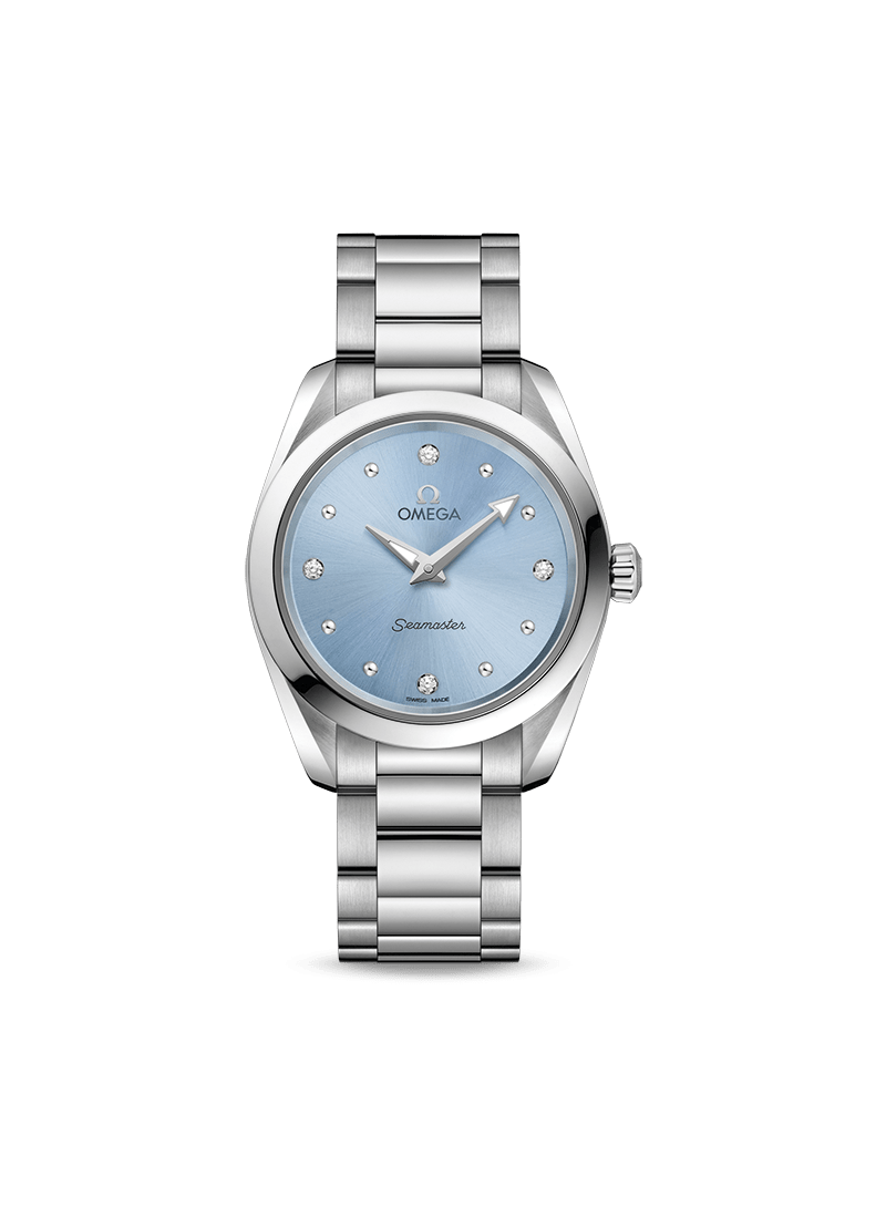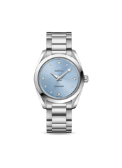 シンメトリックなステンレススティール製の28 mmケースには、グロッシーアイスブルーのダイアルに、8個のロジウムプレートを施したドットインデックスと、ロジウムプレートのホルダーに4個のダイヤモンドをセットしたインデックスが配されています。針にもロジウムプレート加工が施され、ケースバックには、波模様の背景にオメガのシーホースのエンブレムが刻まれています。