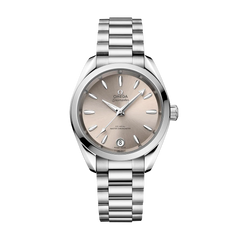 オメガと海の豊かな歴史にオマージュを捧げる「シーマスター アクアテラ」。 シンメトリックな34 mmケースはステンレススティール製で、ポリッシュ仕上げのリュウズ、ケースバックにはウェーブ模様で縁取られたデザインが施されています。