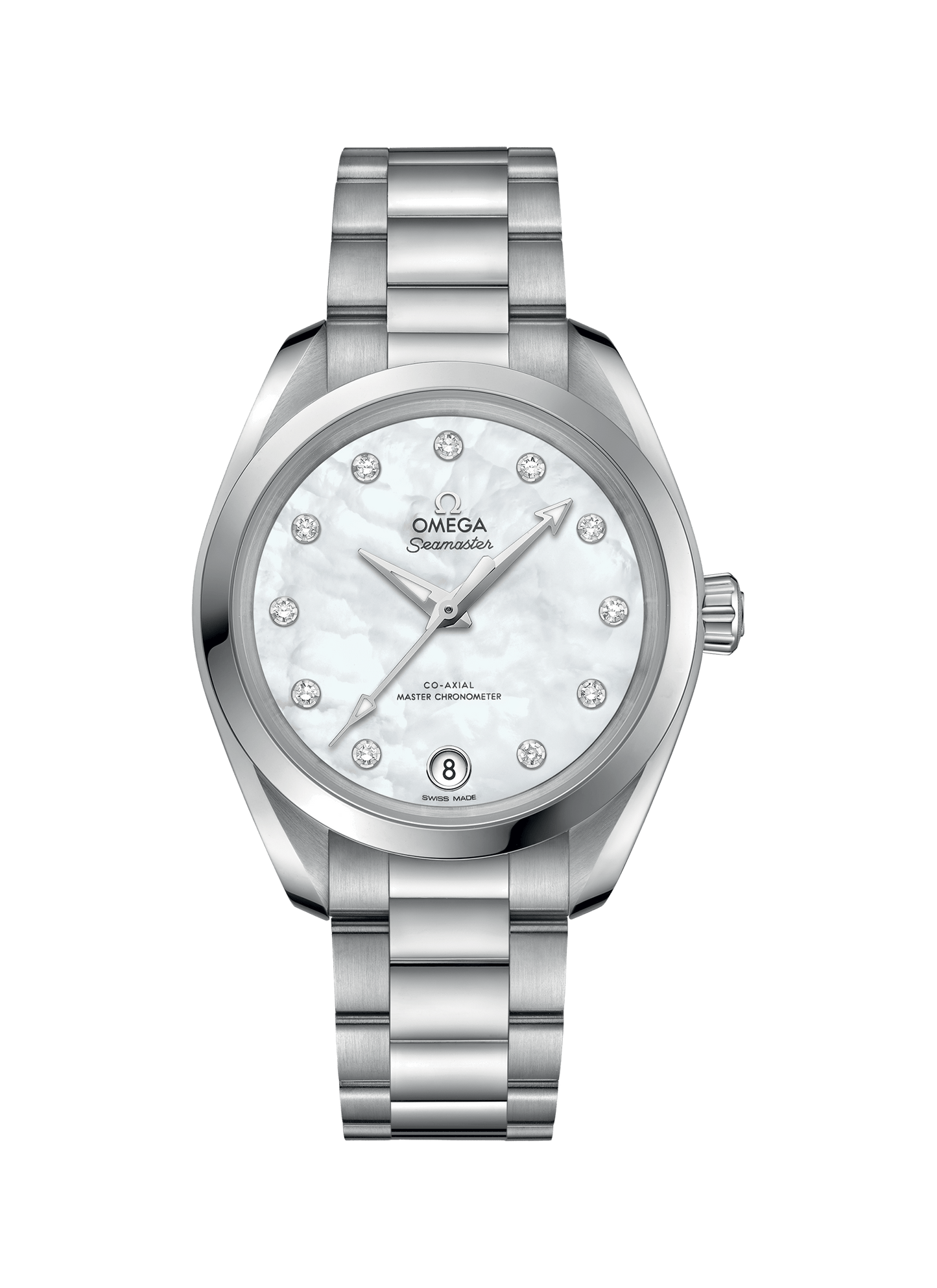 シンメトリックなステンレススティール製の34 mmケースには、ホワイトマザーオブパールのダイアルに、6時位置に日付表示があしらわれ、ロジウムプレートのホルダーに11個のダイヤモンドをセットしたインデックスが配されています。