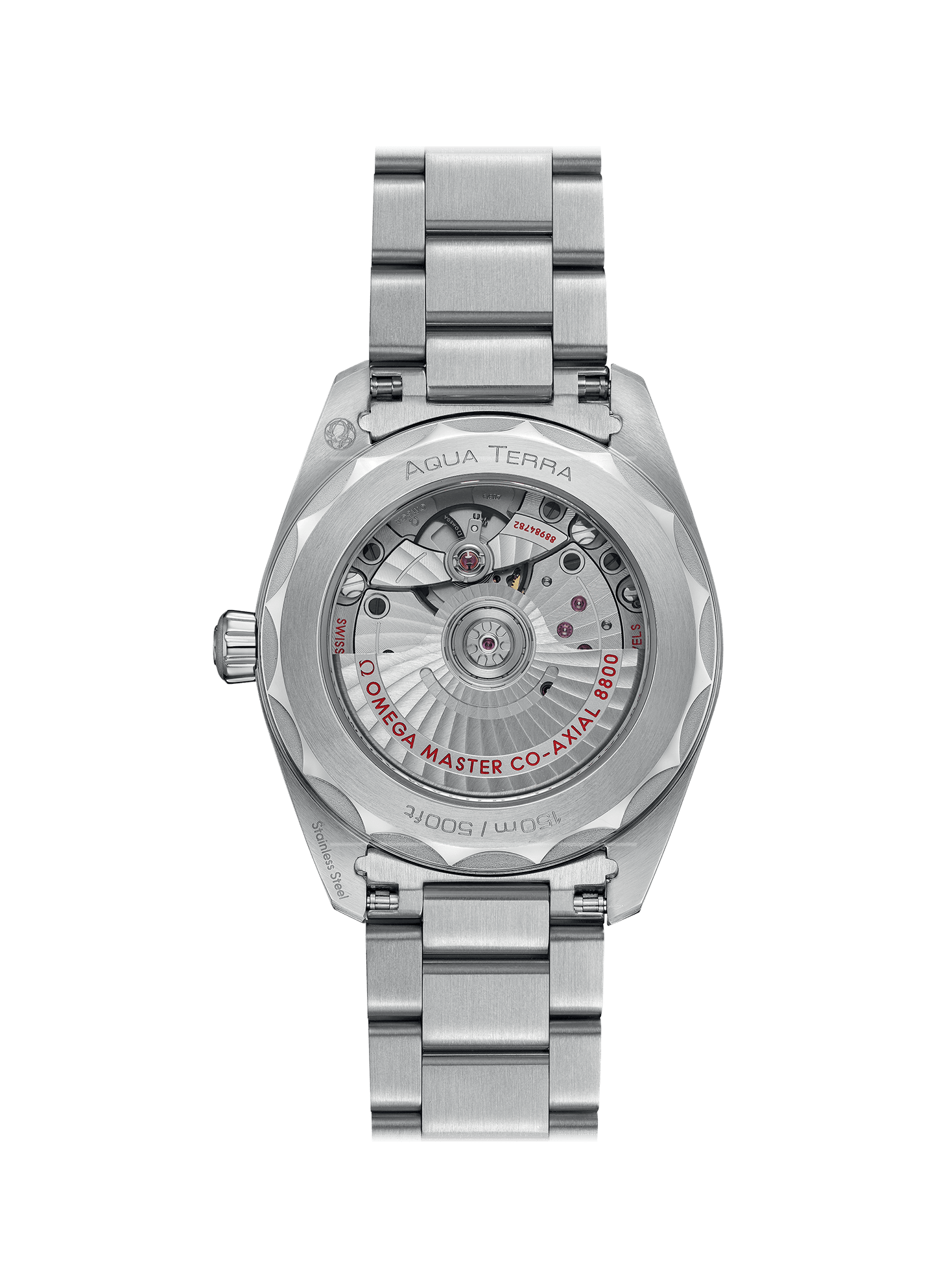 海に携わってきたオメガの長い歴史を代表する「シーマスター アクアテラ」 コレクション。シンメトリックな38mmのケースはステンレススティール製で、ケースバックにはウェーブ模様で縁取られたデザインが施されています。