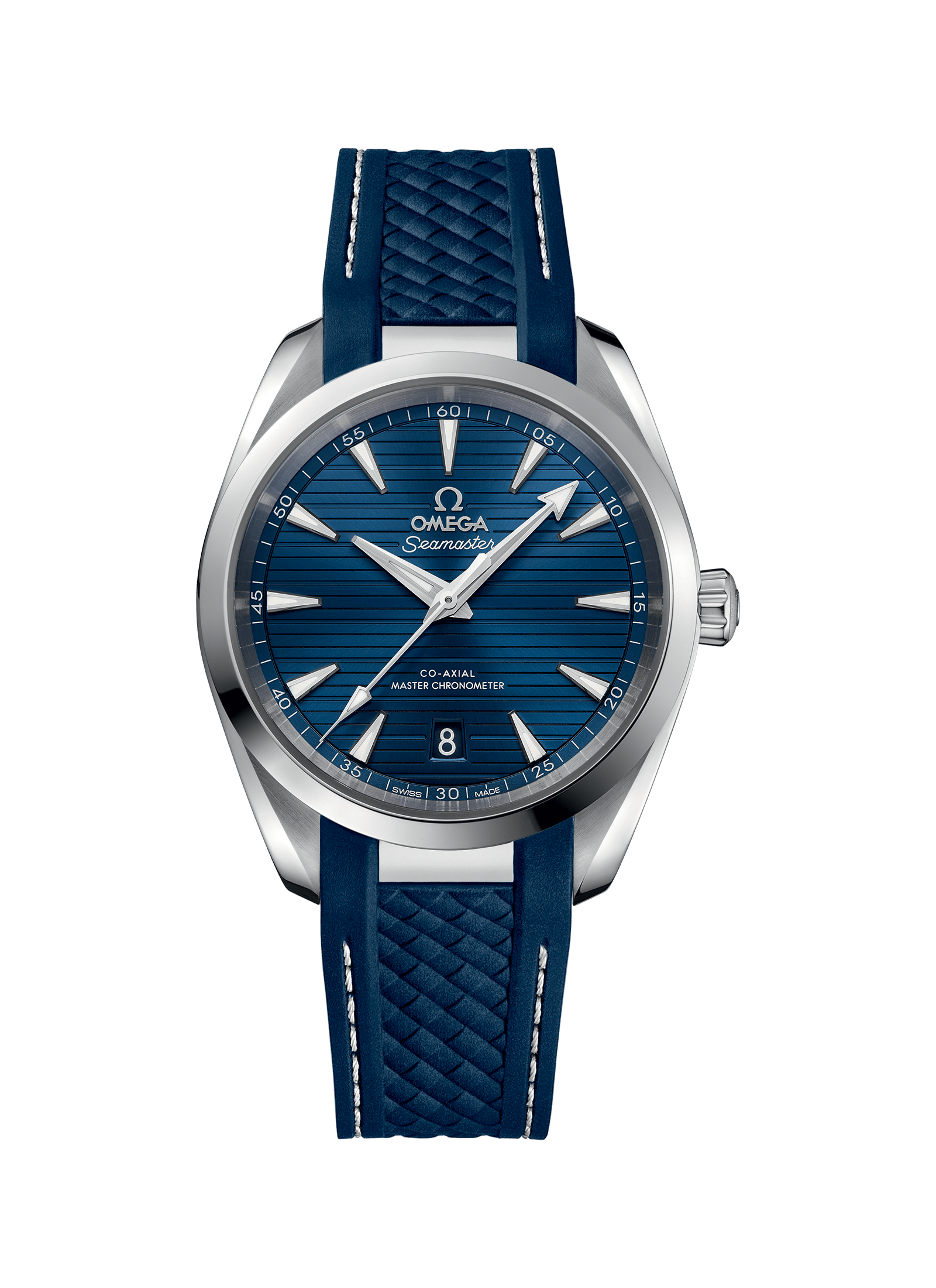 海に携わってきたオメガの長い歴史を代表する「シーマスター アクアテラ」 コレクション。シンメトリックな38mmのケースはステンレススティール製で、ケースバックにはウェーブ模様で縁取られたデザインが施されています。