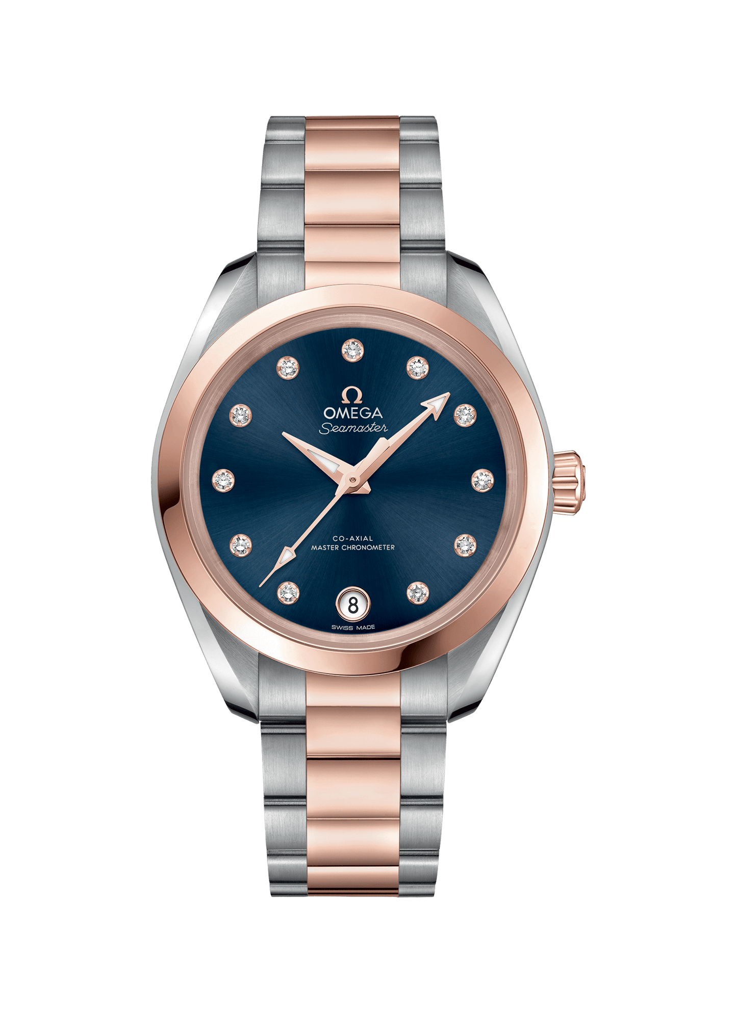 シンメトリックなステンレススティールおよび18Kセドナゴールド製の34 mmケースには、グロッシーオーシャンブルーのダイアルに、6時位置に日付表示があしらわれ、18Kセドナゴールドのホルダーに11個のダイヤモンドをセットしたインデックスが配されています。