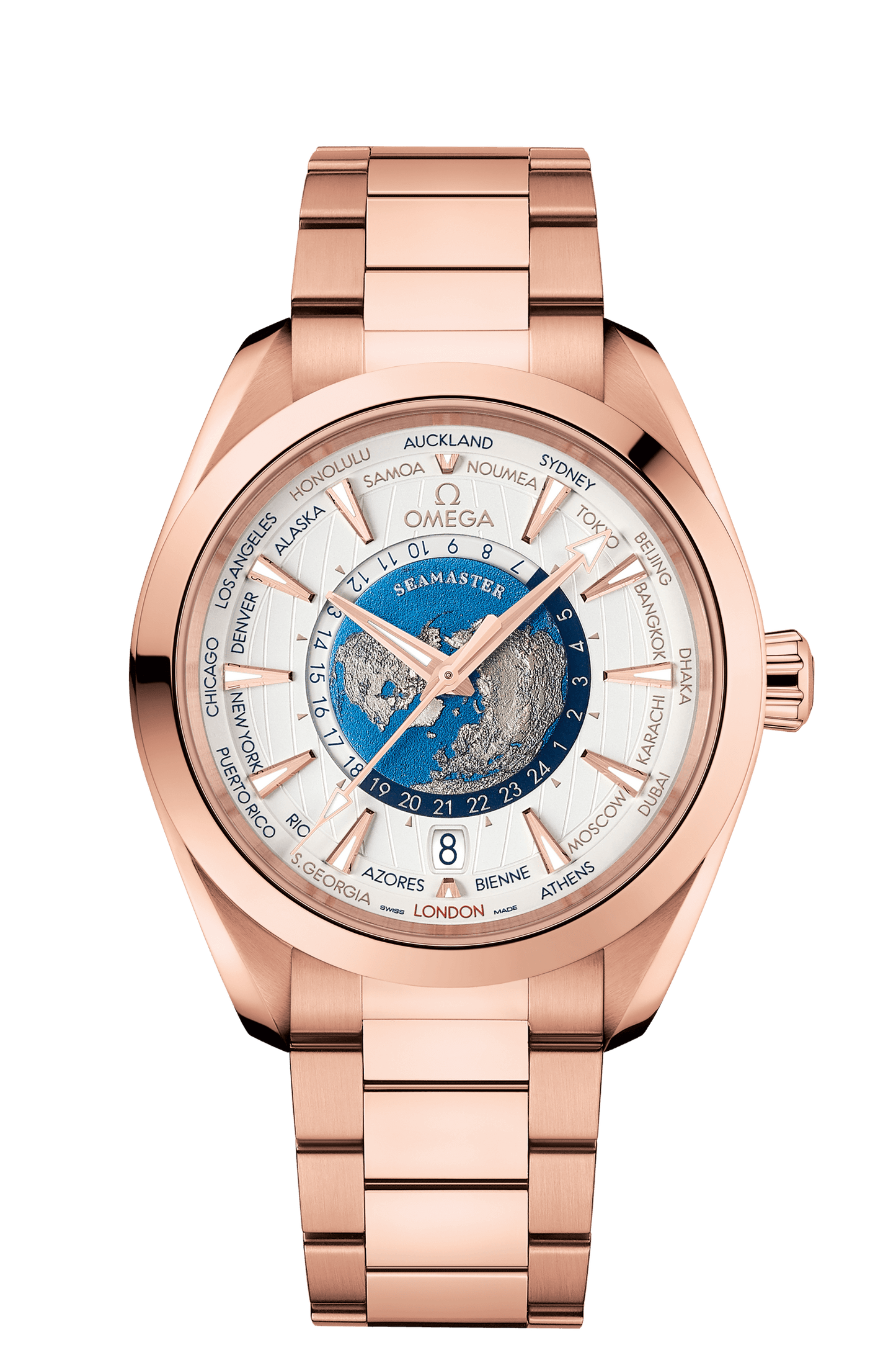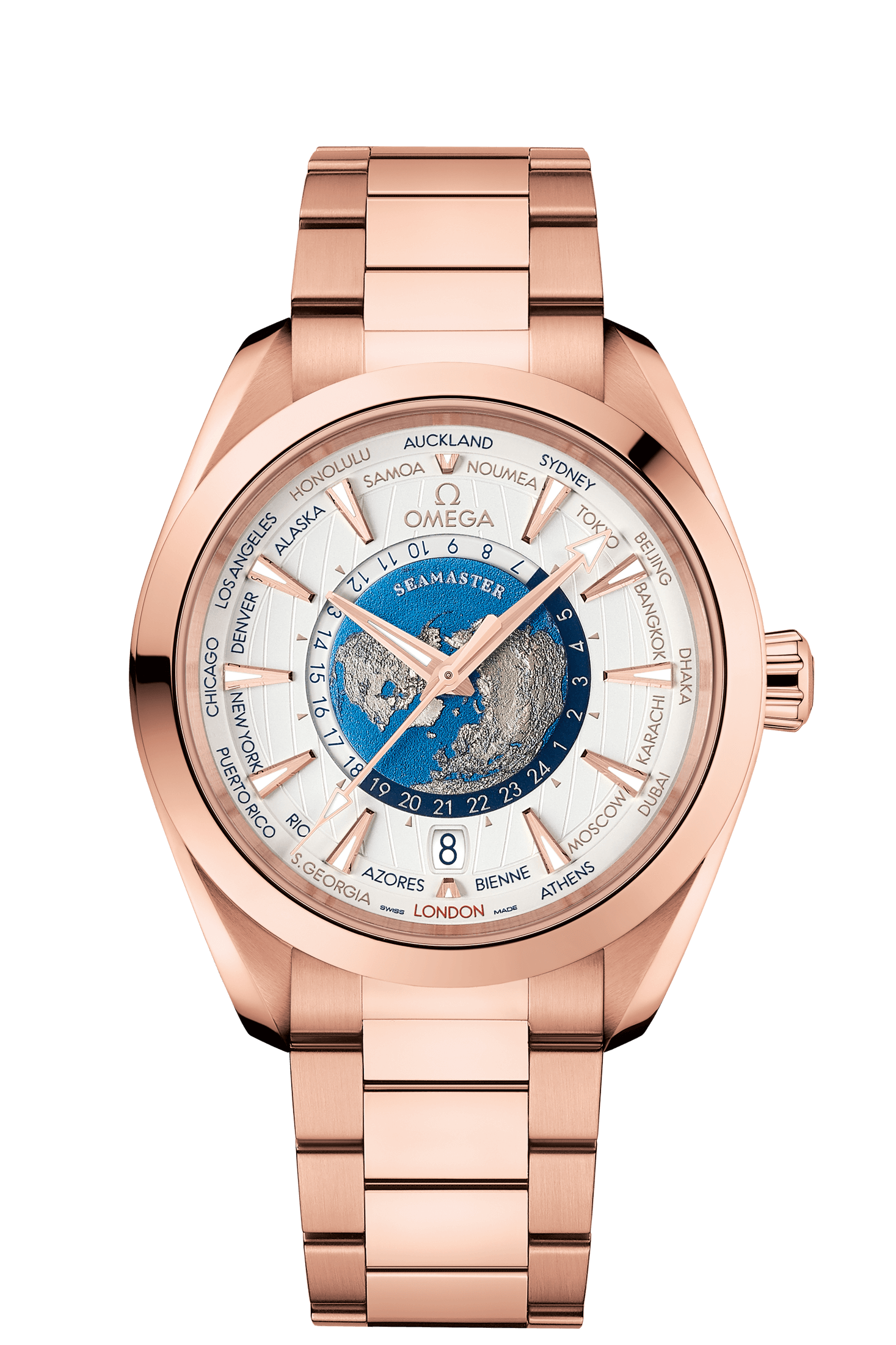 この43 ㎜のワールドタイマーモデルには、ケースとブレスレットにポリッシュ仕上げの18Kセドナ™ ゴールドが採用されています。この素材は針とインデックスにも使われています。