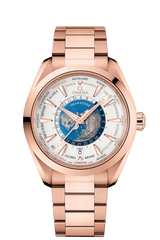 オパリンシルバーのダイアルの外側部分には縦方向のストライプがあしらわれているほか、世界の主要都市名がレッド(GMT)、ブルー(サマータイムがある地域)、セドナ™ ゴールド カラー(サマータイムがない地域)で周囲に施されています。
