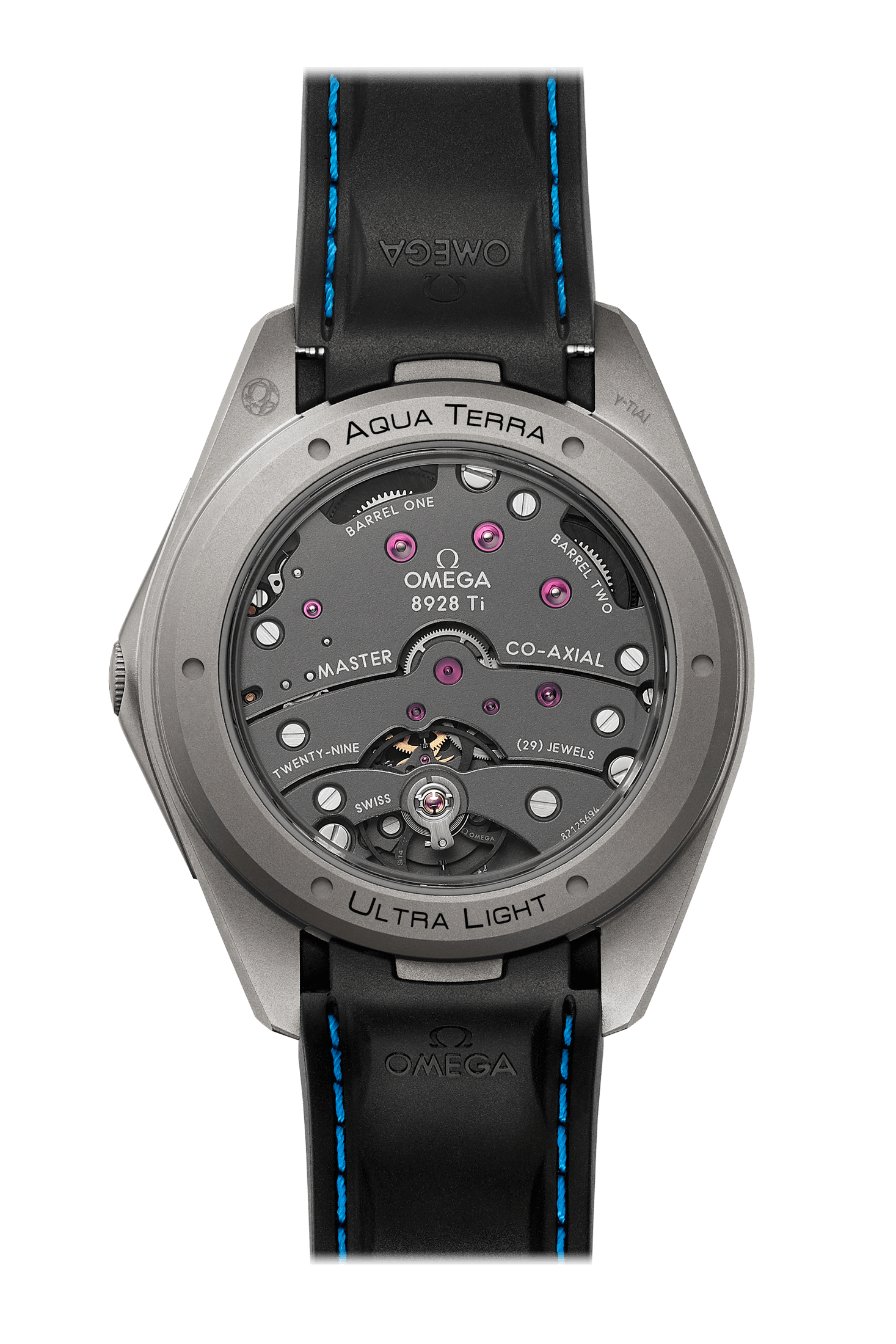 ブラックのラバーストラップが付属。サンドブラスト仕上げのグレード5チタン製のダイアルには、「アクアテラ」のアイコニックなストライプが施されています。また、ストラップをスポーティーなファブリック製のものに交換すると、ウォッチの重さはたった55グラムになります。