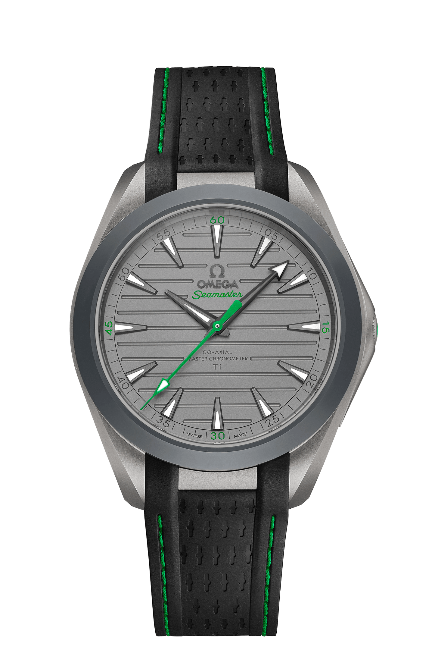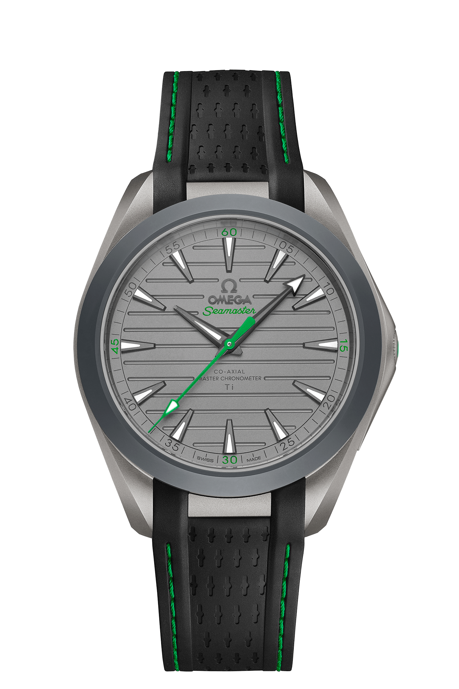 ブラックのラバーストラップが付属。サンドブラスト仕上げのグレード5チタン製のダイアルには、「アクアテラ」のアイコニックなストライプが施されています。また、ストラップをスポーティーなファブリック製のものに交換すると、ウォッチの重さはたった55グラムになります。