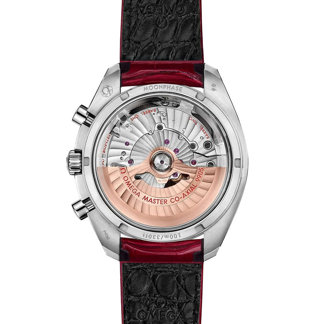 レッドのレザーストラップが付属します。スイス連邦計量・認定局(METAS)認定の最高水準を誇るオメガ マスター クロノメーター キャリバー9905搭載。