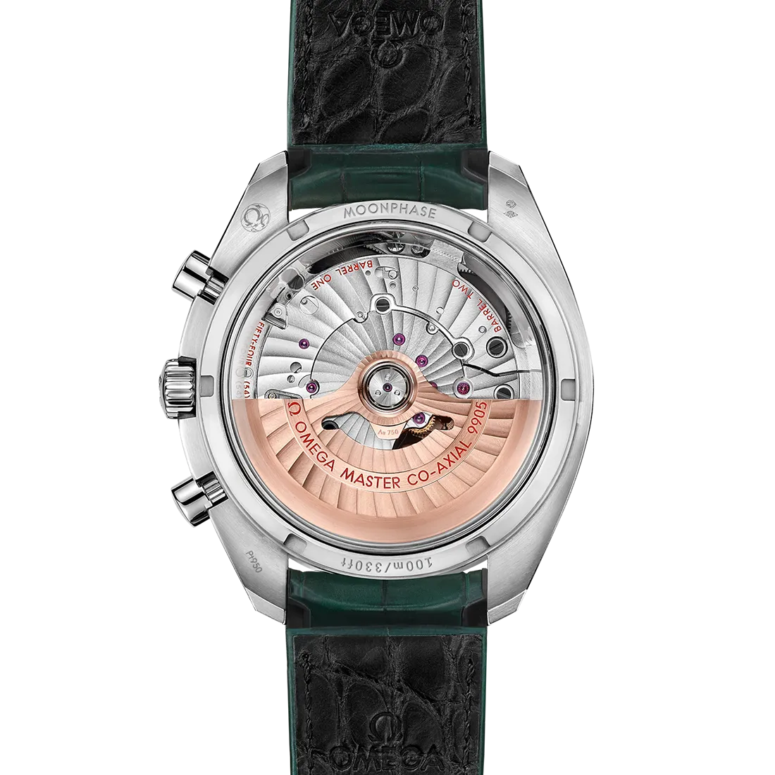 | ムーブメント | コラムホイールとコーアクシャル エスケープメント搭載の自動巻きクロノグラフムーブメント。METAS認定のマスター クロノメーター。15,000ガウス以上の耐磁性能。シリコン“Si14”製テンプ、2重香箱。中央の時針、分針、クロノグラフ秒針、スモールセコンド、針による日付表示、12時間積算計、60分積算計、ムーンフェイズ表示。18Kセドナ™ ゴールド製のローターとブリッジ。 |