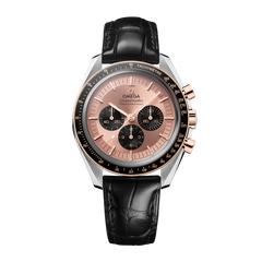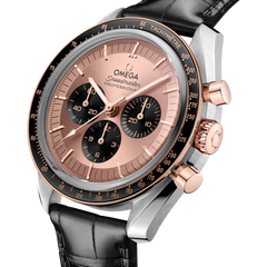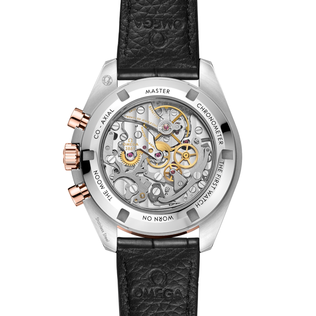 バイカラーに彩られたケースサイズ42mmのステンレススティール&18Kセドナ™ゴールド製モデルは、フロントとケースバックにサファイアクリスタルガラスが採用されています。月面で着用された第4世代の「スピードマスター」のスタイルにインスピレーションを得たデザインで、アシンメトリーなケースにセットされたブラックセラミック製ベゼルリングには、有名な「ドットオーバー90(90の上のドット)」を含むタキメータースケールがオメガのセラゴールド™技術で施されています。