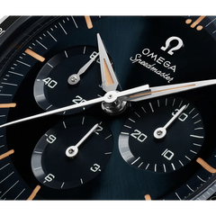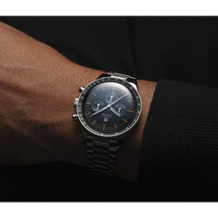 ポリッシュ&ブラッシュ仕上げのステンレススティール製の39.70mm径ケースに、オメガが特許取得済みのコンフォートリリースシステムを採用した「フラットリンク」ブレスレットを合わせました。ブラックアルミニウム製ベゼルリングには、アイコニックな「ドット」 「オーバー90(90上のドット)」を含む伝説的なタキメータースケールが実施されています。