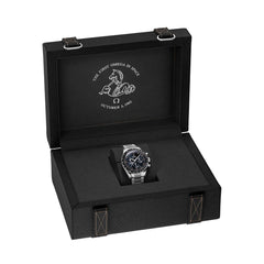 ダイアルとリュウズにはヴィンテージのオメガロゴがあしらわれ、ケースバックには有名なシーホースのメダリオン、そして「THE FIRST OMEGA IN SPACE」、「OCTOBER 3, 1962」の文字のエングレービングが施されています。