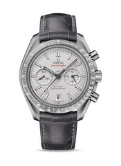 「スピードマスター グレーサイド オブ ザ ムーン」。スピードマスターの"ダーク サイド オブ ザ ムーン"コレクションに革命的なタイムピースが加わりました。 グレーのセラミック製ケース、サンドブラスト仕上げの950グレードのプラチナ製ダイアル、“ムーンウォッチ”スタイルの針、セラミック製ベゼル、ホワイトのスーパールミノヴァを施したタキメータースケールを備えるこのモデルは、冒険にふさわしいだけでなく、格別にスタイリッシュな魅力をも備えています。 伝説の先代モデル「スピードマスター グレーサイド オブ ザ ムーン」の特徴を継承し、3時位置には60分と12時間の積算計、9時位置にはスモールセコンドサブダイアルが配置されています。また、面取りを施したサファイア・クリスタルガラスの裏蓋を通して、オメガ コーアクシャル キャリバー9300を眺めることができます。 セラミックとチタン素材のフォールディングクラスプも、新たに採用されています。