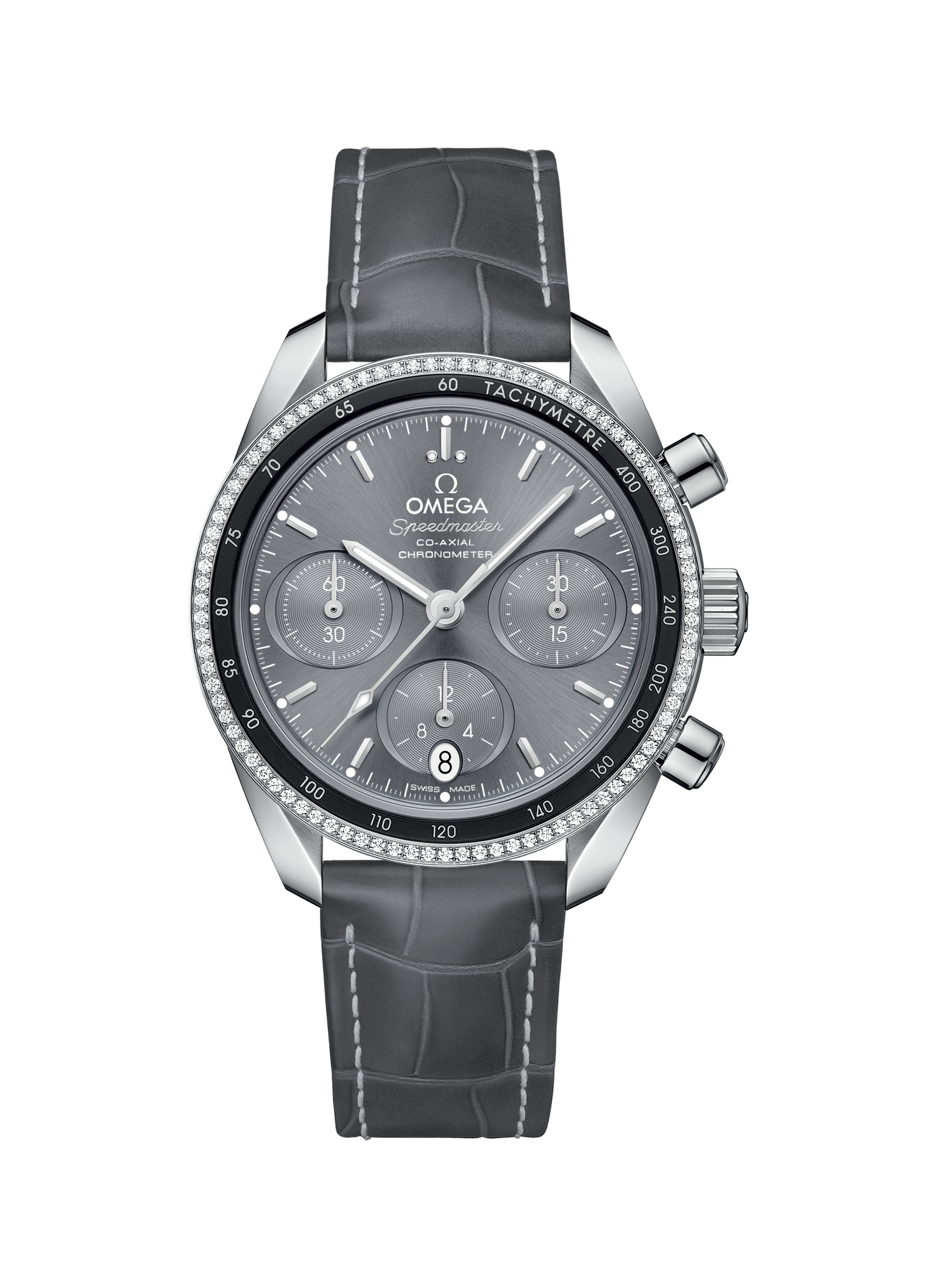 ステンレススティール製ケースに組み合わされた、デュアルベゼルのデザインが特徴です。ベゼルの内側にはブラックのアルミニウム製リングにタキメータースケールを搭載し、外側にはダイヤモンドパヴェをあしらいました。