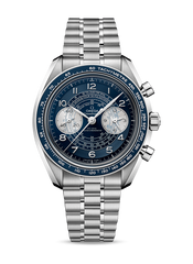 9時位置にスモールセコンドカウンター、3時位置にシルバー60分および12時間積算計を備え、ステンレススティール製のブレスレットが合わせられています。オメガ コーアクシャル マスター クロノメーター キャリバー9908搭載。
