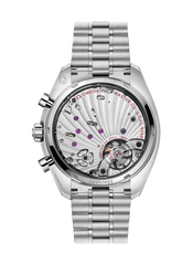 ステンレススティール製の43mmサイズのケースに、シルバーカラーのサブダイアルを備えたブルーの文字盤。タキメータースケールを備えたベゼルリングは陽極酸化処理を施したブルーのアルミニウム製。リーフ型の針とアラビア数字にはロジウム仕上げが施され、数字の下にはスパイラルを描く独特なレーストラックのパターンがあしらわれています。