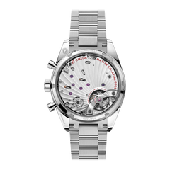 コラムホイールとコーアクシャル エスケープメント搭載の手巻きクロノグラフ。METASによるマスター クロノメーター認定を受け、15,000ガウスの耐磁性能を持つ。シリコン製ヒゲゼンマイ、直列に設置された2つの香箱、タイムゾーン機能。センター時・分・クロノグラフ秒針、日付表示、スモールセコンド、12時間と60分の同軸積算計。アラベスク模様のコート・ド・ジュネーブ装飾。 60時間 パワーリザーブ 手巻き 振動数 4 HZ |