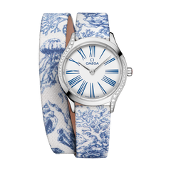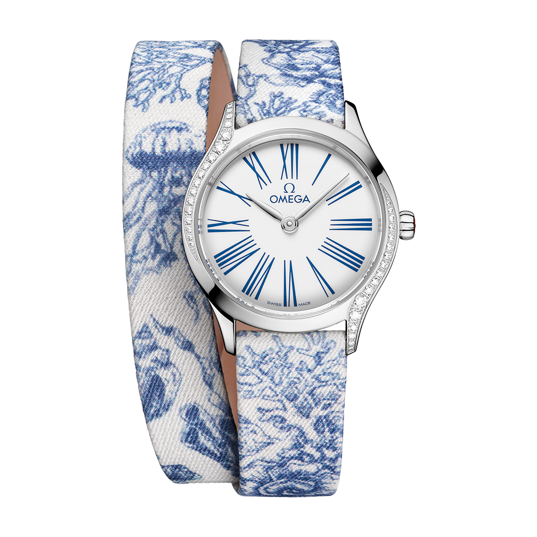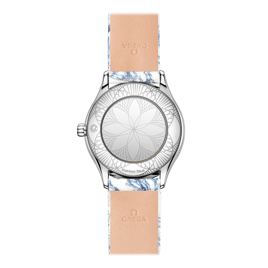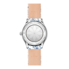 この時計には、豊かな海からの贈り物を描いたブルーシー デザインのユニークなトワル・ドゥ・ジュイ ファブリックのダブルストラップがセットされています。鏡面仕上げと「Her Time」のパターンが施されたメタリック加工のサファイアクリスタル製のケースバックにはオメガ キャリバー 4061が搭載されています。