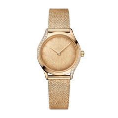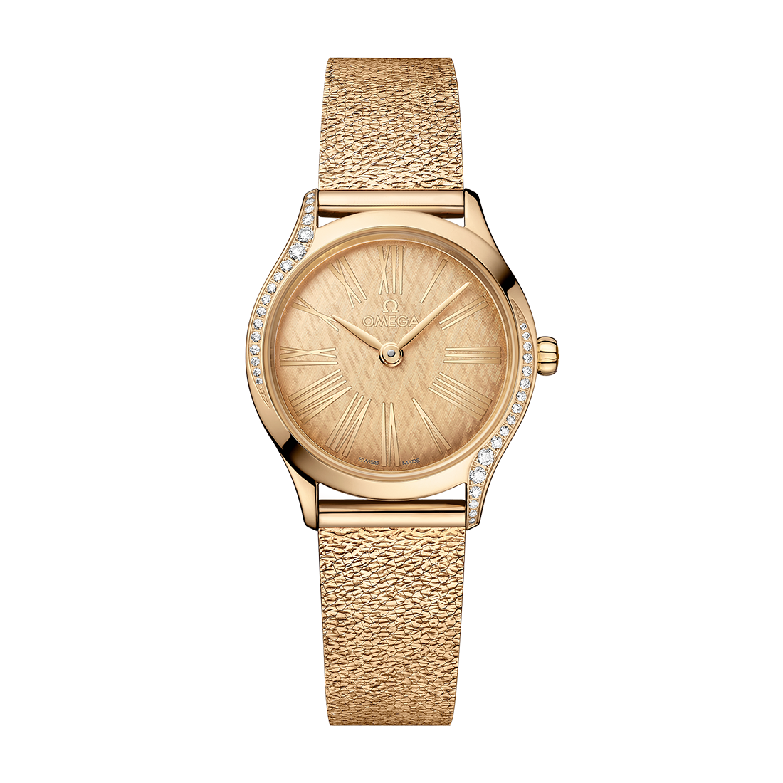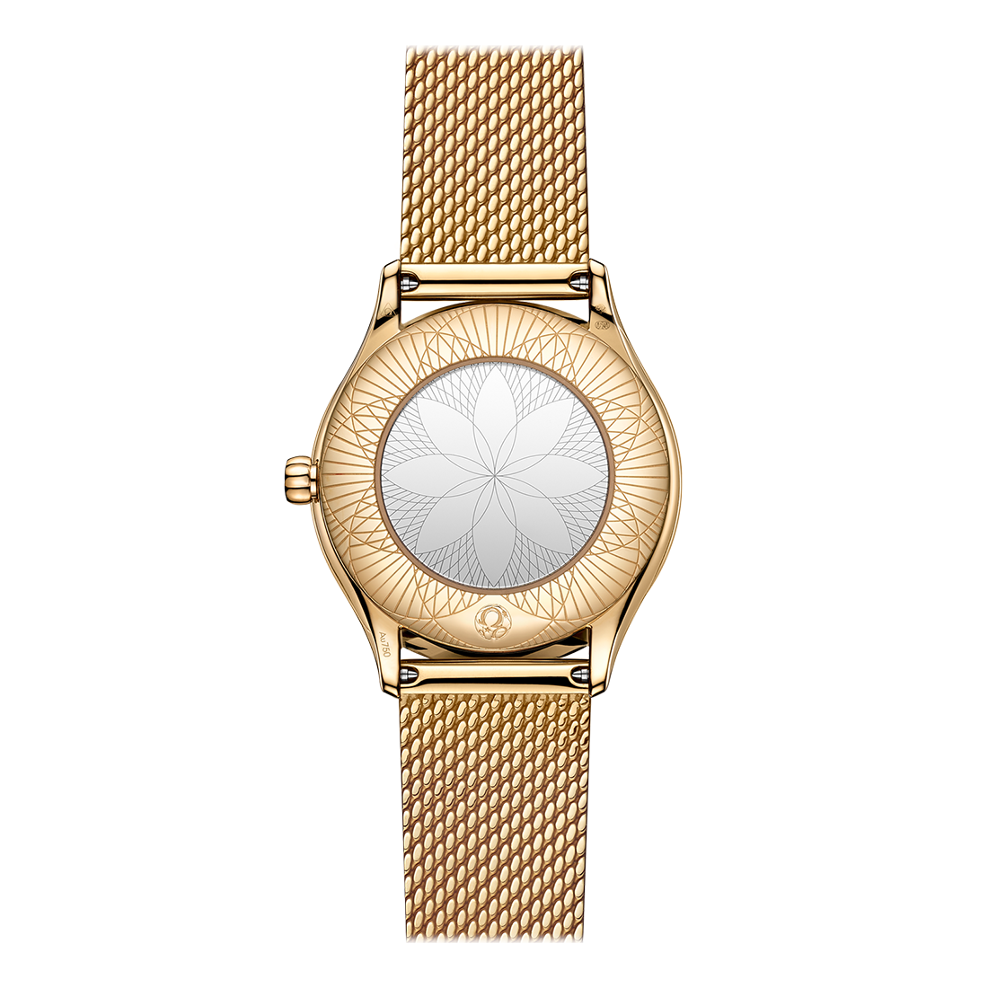 ミニ トレゾアは、オメガの最も現代的なレディス コレクションをより洗練させたモデルです。コンパクトなサイズとダイナミックなスタイルは、手首の上で目を引きます。18Kムーンシャイン™ゴールドのこのモデルは、26mmのケースの両サイドにダイヤモンドがエレガントな曲線を描くように敷き詰められています。リュウズにはリキッドセラミック製の赤いフラワーモチーフがあしらわれ、一粒のダイヤモンドがセットされています。ドーム型のダイアルは18Kムーンシャイン™ゴールド製で、シルク生地のようなパターンと、ダイヤモンドポリッシュ仕上げの針、エンボス加工のローマ数字インデックスがコントラストを成しています。この時計には、シルク生地のようなパターンがエンボス加工された18Kムーンシャイン™ゴールド製メッシュブレスレットに特別なフォールディングクラスプが付属します。鏡面仕上げと「Her Time」のパターンが施されたメタリック加工のサファイアクリスタル製のケースバックにはオメガ キャリバー 4061が搭載されています。