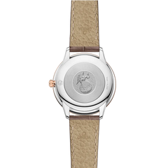 この直径30mmのステンレススティール & 18Kセドナ™ ゴールド製モデルは、ホワイト マザーオブパールのダイアルを備えています。また、PVD セドナ™ ゴールド カラーの針と、18K セドナ™ ゴールド製ホルダーにセットされたダイヤモンドとローマ数字のインデックスが交互に配されています。