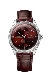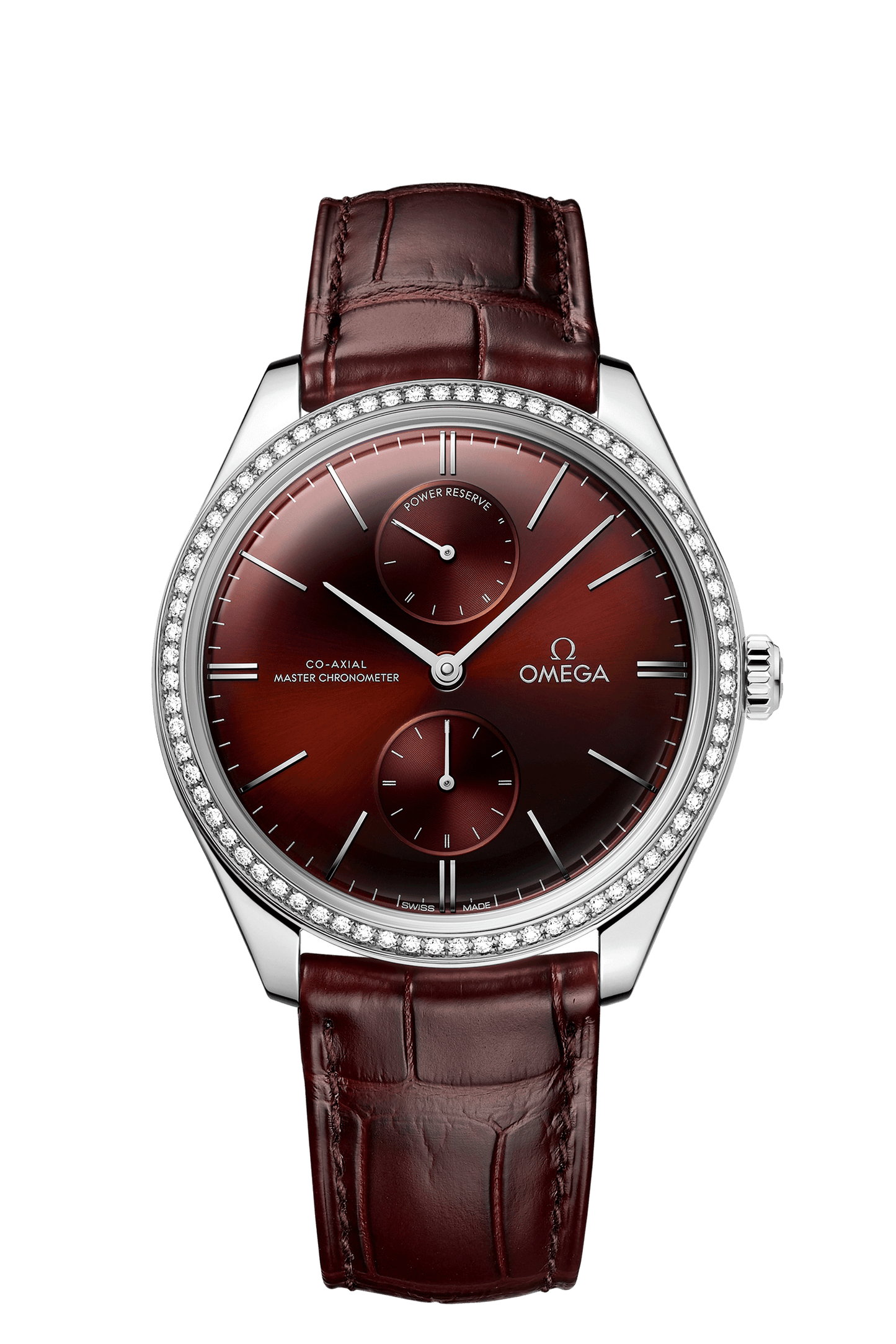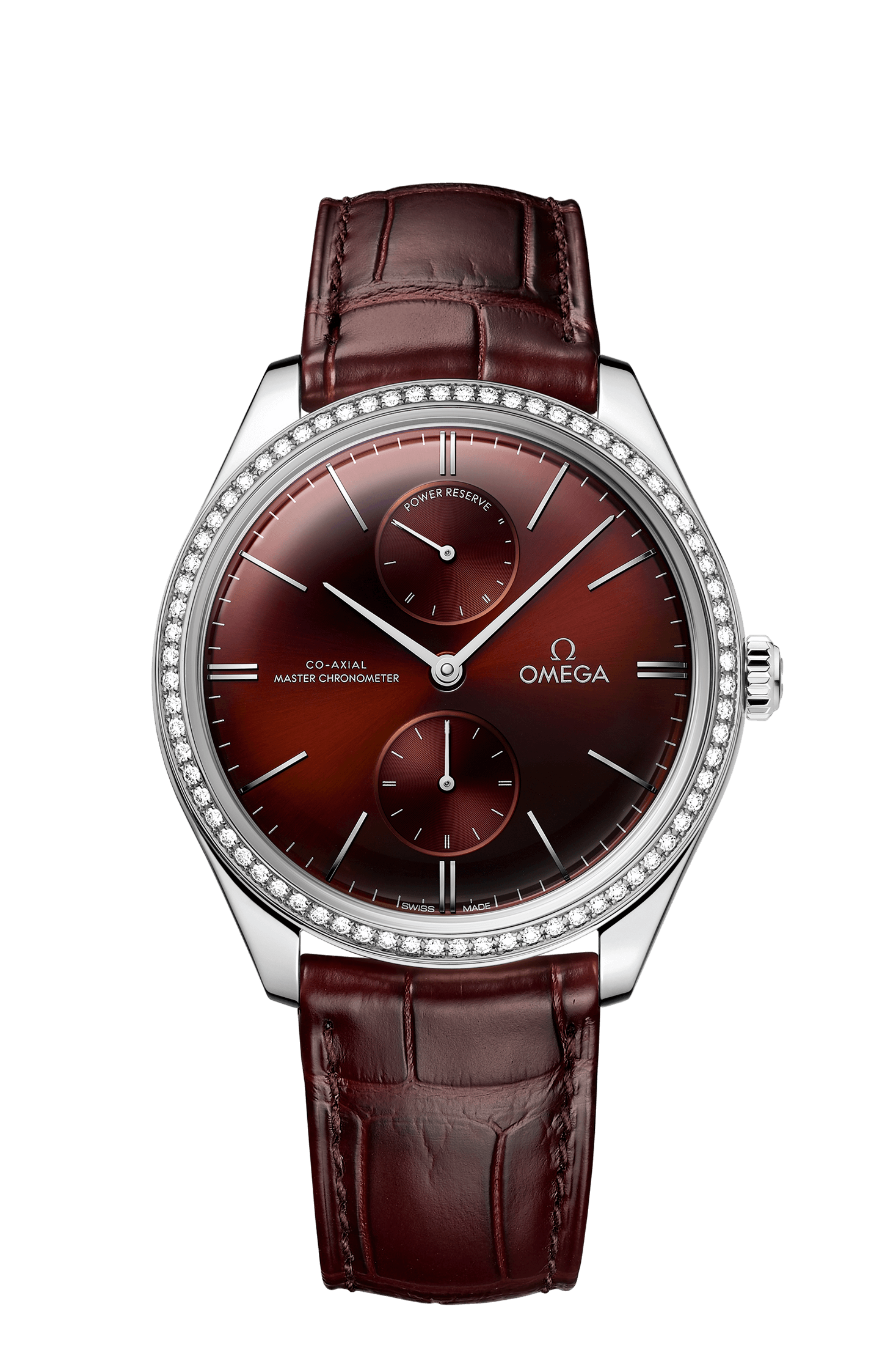 バーガンディのレザーストラップが合わせられたこのモデルは、40mmのポリッシュ仕上げのステンレススティール製ケースとベゼルに72個のフルカット ダイヤモンドがパヴェセッティングされています。同じくバーガンディのドーム型ダイアルは、18Kホワイト ゴールド製の針とインデックス、そして6時位置にスモールセコンド、12時位置にパワーリザーブ表示を備えています。