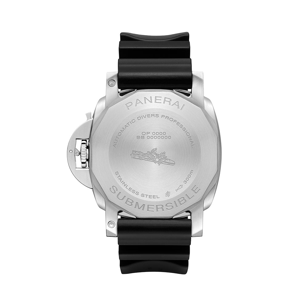 スティールケースを備えたサブマーシブル クアランタ クアトロは、針、ドット、インデックスを強調する対照的なホワイトのスーパールミノヴァ™が、ブラックの文字盤に映えるデザインです。