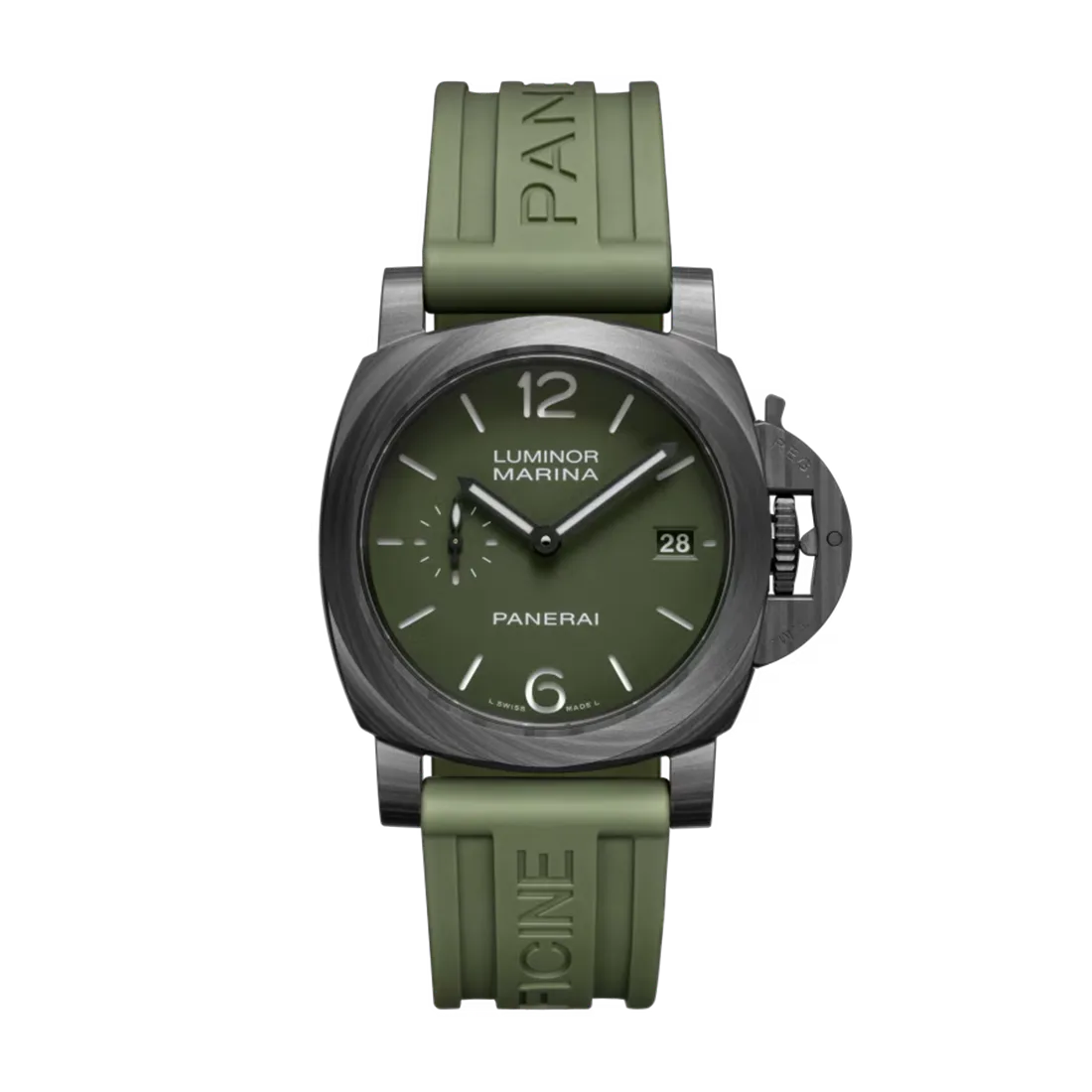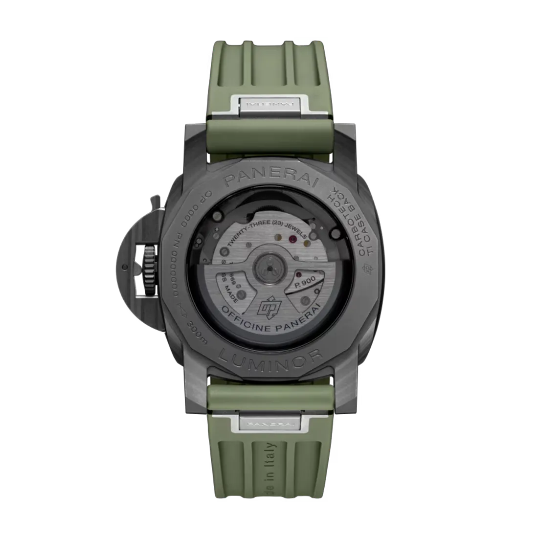 ベゼル:カーボテック™ ケースバック:ねじ込み式、サファイアクリスタルのシースルーとチタンDLC 文字盤:グリーンに夜光アラビア数字とアワーインデックス。3時位置に日付、9時位置にスモールセコンド。 ブレスレット/ストラップ:カウッチューグリーン、STD, 22/20, BA, PAM Click Release System バックル:バックル: DLCコーティングを施した台形サテンスティール、 20mm、PAM クリック™ |