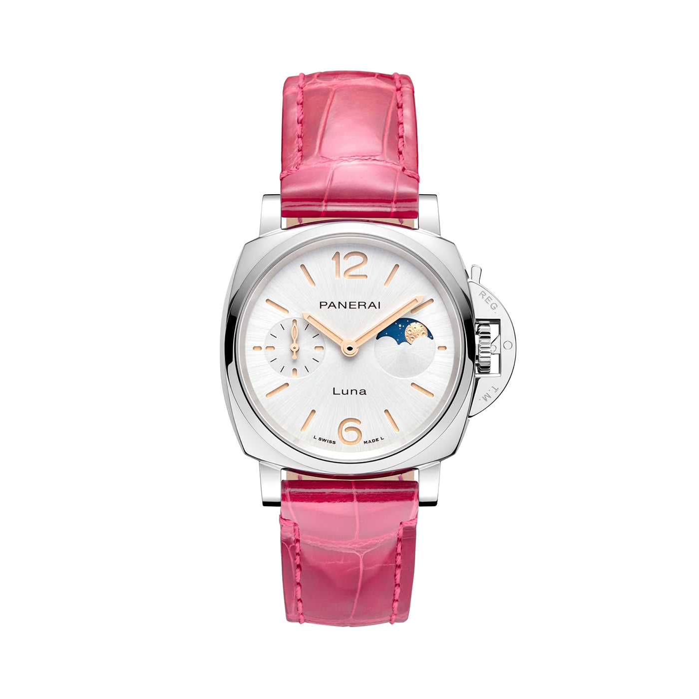 ルミノール ドゥエ ルナは、最も詩的なコンプリケーションであるムーンフェイズを中心に、イタリア語で月を意味する「ルナ」を文字盤に配しています。38mmとスリムなサイズ感で、3時位置には星がきらめくミッドナイトブルーの夜空を背景に、24カラットの月を備えた回転ディスクが配されています。