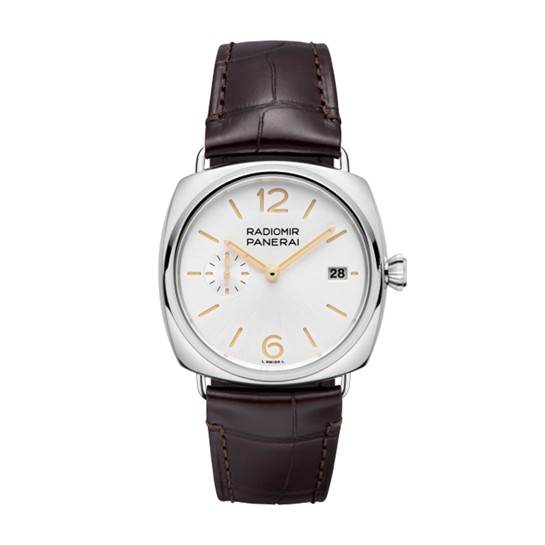 ベゼル:ポリッシュスティール ストラップ:アリゲーター Espresso, 24.0/18.0 スタンダード サイズ 文字盤:ホワイト、サンブラッシュ仕上げ、夜光アラビア数字とアワーインデックス。3時位置に日付、9時位置にスモールセコンド |