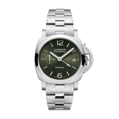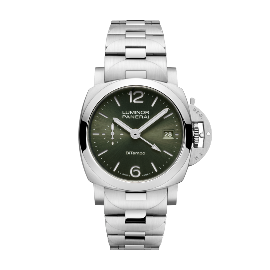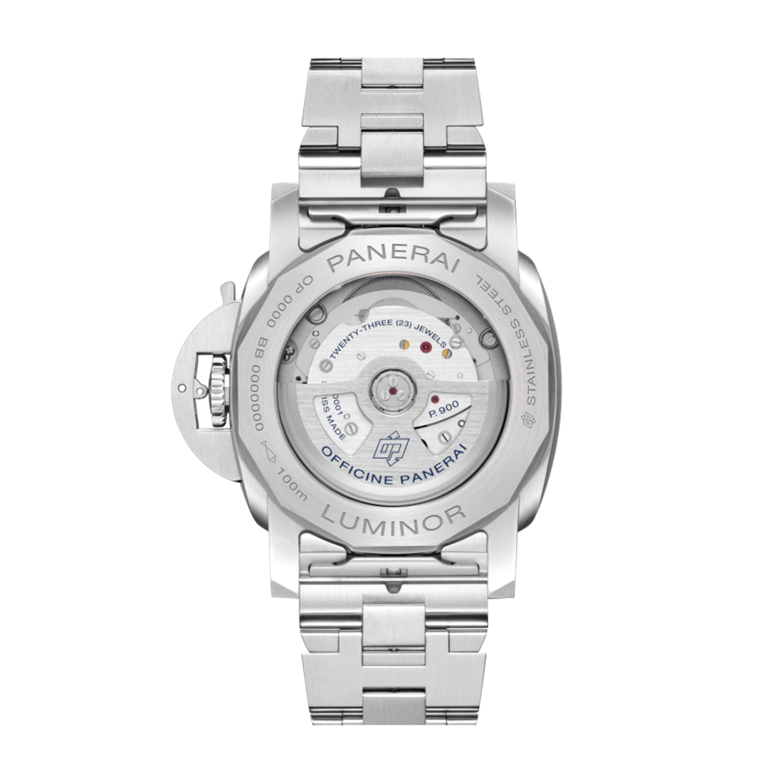 ベゼル:ポリッシュスティール ケースバック:サファイアクリスタルのシースルーとスティール 文字盤:グリーンに夜光アラビア数字とアワーインデックス。3時位置に日付、9時位置にスモールセコンド。 ブレスレット/ストラップ:「OP」ロゴが刻印されたポリッシュ/サテンスティール。PAM クリック™ |