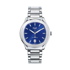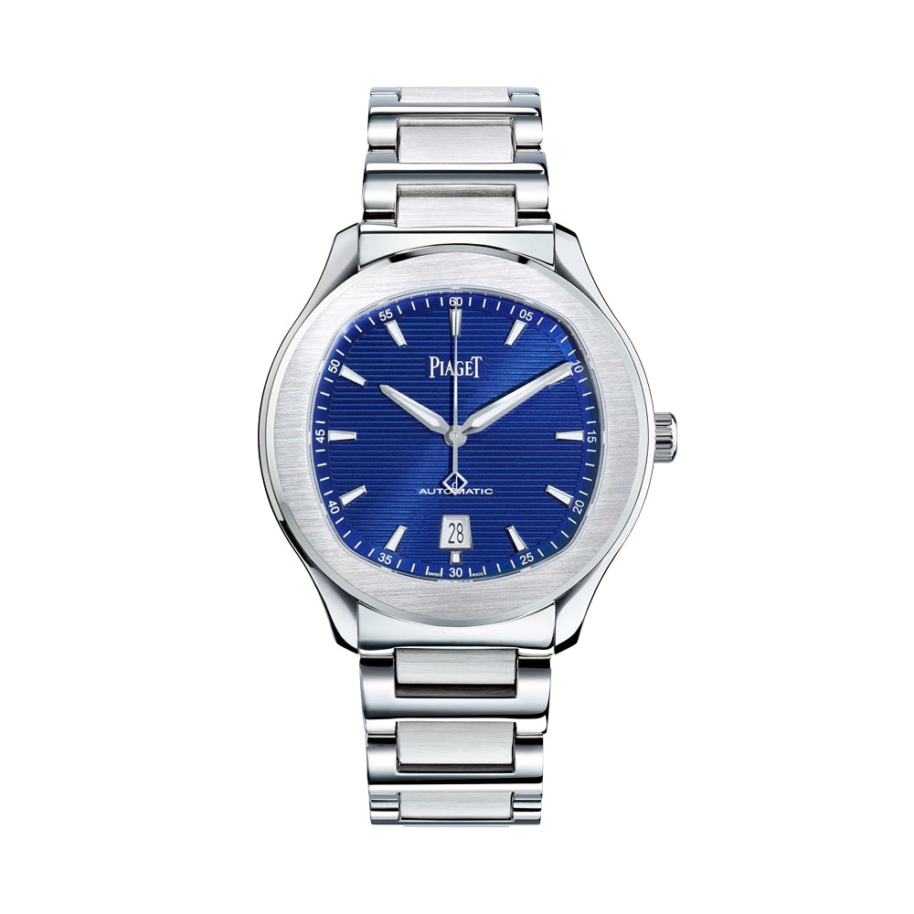 カジュアルでエレガント。どんなシーンにもふさわしい力強い個性を備えた自動巻メンズウォッチ。ブレスレットは、ポリッシュ仕上げとサテン仕上げのステンレススチール製。ラウンド型とクッション型を融合させたミドルケース。水平ギョーシェ模様のブルー文字盤にはスーパールミノバ加工のインデックス、時、分、秒針、6時位置にカレンダー表示が配されています。直径42mmのステンレススチール製ケースにはポリッシュ仕上げとサテン仕上げが交互に施され、サファイアケースバックからは1110Pピアジェ自社製自動巻ムーブメントと、ピアジェの紋章が刻印されたチャコールグレーのローターの繊細な仕上げを見ることができます。細部まで美しい秒針には、スイスのマニュファクチュールの象徴として、透かし模様のPがあしらわれています。
