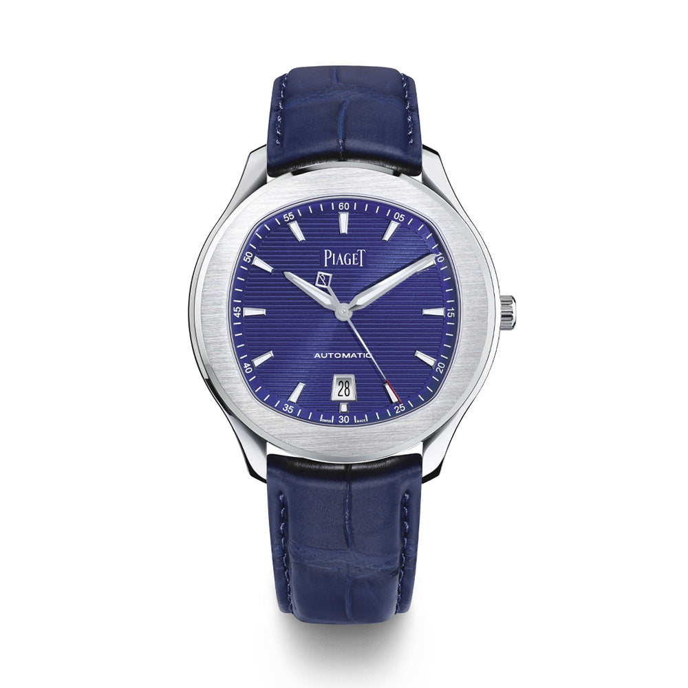 カジュアルでエレガント。どんなシーンにもふさわしい力強い個性を備えた自動巻メンズウォッチ。ブレスレットは、ポリッシュ仕上げとサテン仕上げのステンレススチール製。ラウンド型とクッション型を融合させたミドルケース。水平ギョーシェ模様のブルー文字盤にはスーパールミノバ加工のインデックス、時、分、秒針、6時位置にカレンダー表示が配されています。直径42mmのステンレススチール製ケースにはポリッシュ仕上げとサテン仕上げが交互に施され、サファイアケースバックからは1110Pピアジェ自社製自動巻ムーブメントと、ピアジェの紋章が刻印されたブルーのローターの繊細な仕上げを見ることができます。細部まで美しい秒針には、スイスのマニュファクチュールの象徴として、透かし模様のPがあしらわれています。ブルーのアリゲーターストラップにはフォールディングバックルが付いています。