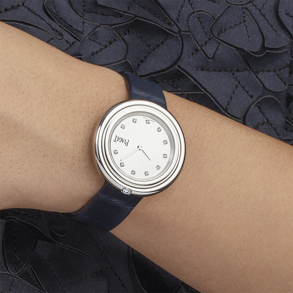 ピアジェのアイコンジュエリー、POSSESSIONからインスピレーションを得たウォッチ。回転リングには1粒のダイヤモンドが配され、カジュアルでありながらエレガントな輝きを持つステンレススチールの文字盤にはダイヤモンドのインデックスが組み合わされています。インターチェンジャブルストラップなので、装いに合わせてさまざまなバリエーションを楽しめます。