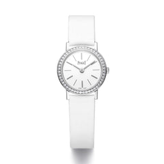 エレガントな薄型ウォッチの代名詞であるALTIPLANO。ほのかな光沢のホワイトの文字盤にはソフトな色合いのインデックスが組み合わされています。ゴールド製のケースにはダイヤモンドがセットされ、洗練された華やぎを添えています。