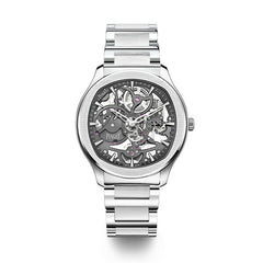ローターを組み込んだスレートグレーのムーブメントが時を刻むさまを目にすることができるスケルトン構造、インターチェンジャブルストラップを採用し、硬質なステンレススチール製とグレーのアリゲーターストラップを付け替えてお楽しみいただけます。