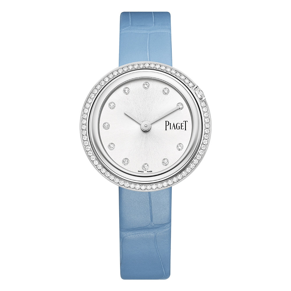 Possession、34mm、ステンレススチール製ケースにラウンドブリリアントカットダイヤモンド計約0.61カラット、シルバー文字盤にラウンドブリリアントカットダイヤモンド計約0.09カラット、インターチェンジャブルストラップ、358Pピアジェ自社製クオーツムーブメント