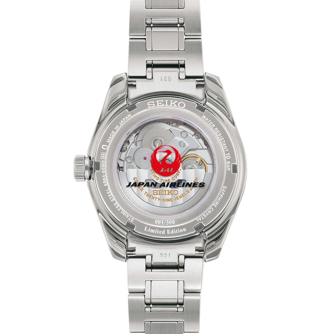 シースルーバックの裏ぶたには、JALロゴが印刷されています。また外周の金属部分に、数量限定モデルの証として、「LIMITED EDITION」の文字とシリアルナンバーが入ります。