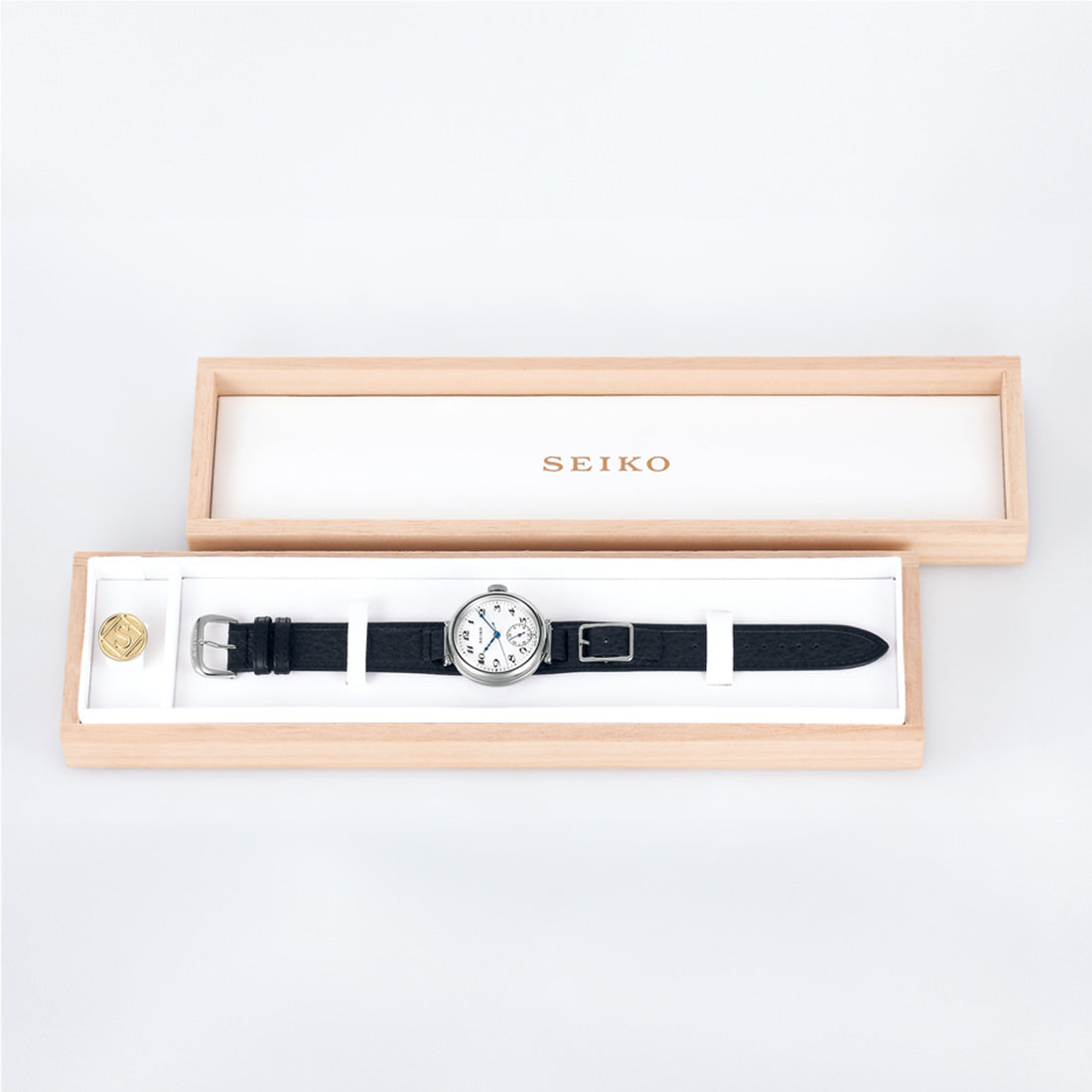 金太郎が1900年(明治33年)に登録したセイコーの前身である服部時計店の商標「丸角Sマーク」を立体的にかたどった特製ピンバッジが付属します。復刻ロゴがポイントのスペシャルボックスに収めてお届けします。