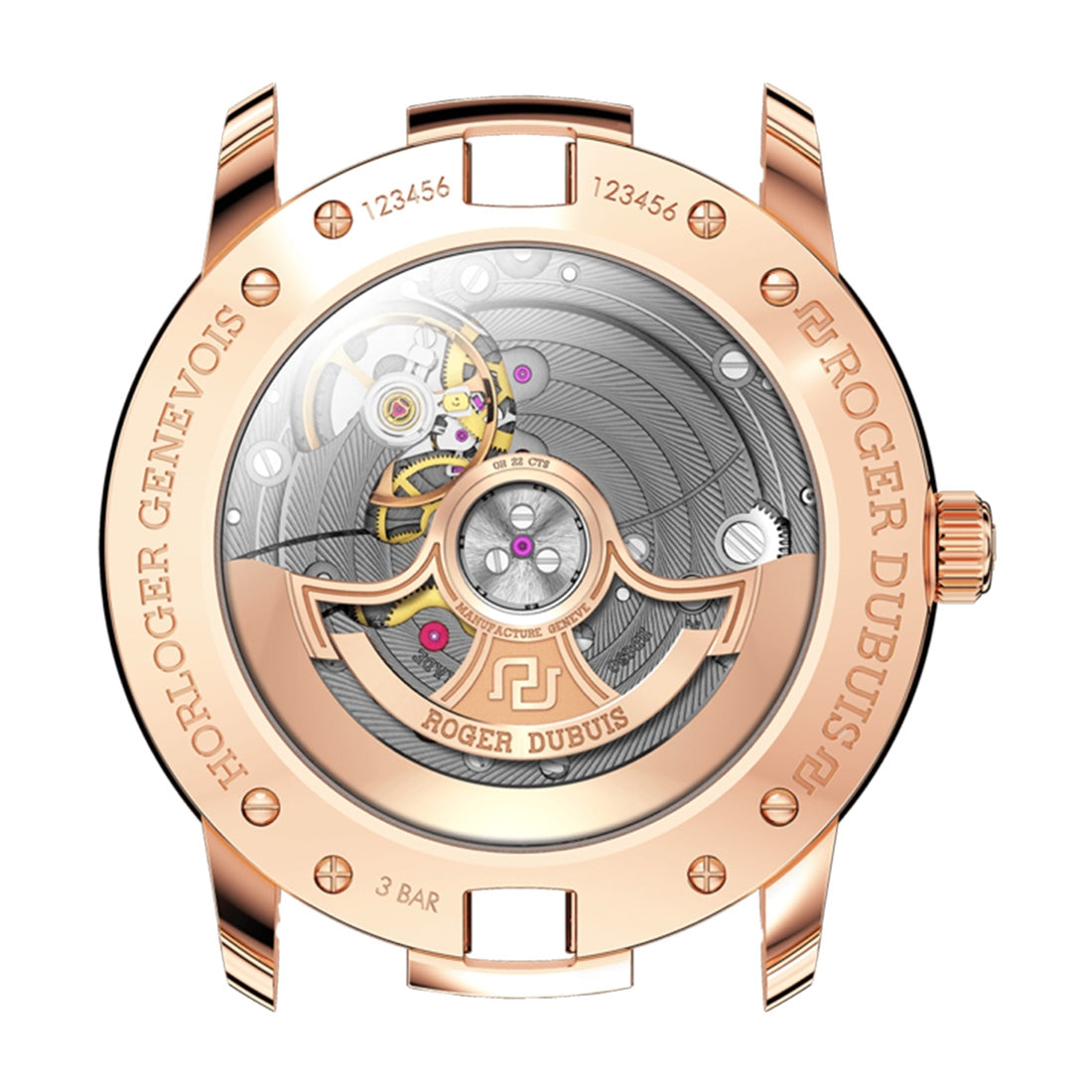 | ムーブメント | ロジェ・デュブイの自動巻き機械式ムーブメントが時・分・秒とデイトを表示