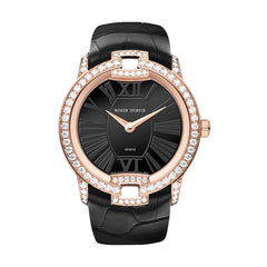 ダイヤル:ブラックラッカーダイヤル、トーンオントーンのローマ数字、12時と6時はブラックポリッシュアプライドアワーマーカー、トランスファー印刷のテキスト ストラップ:アリゲーターストラップ(ブラック) クラスプ:ピンクゴールド、ラウンドダイヤモンドセット、ダブルフォールディング |