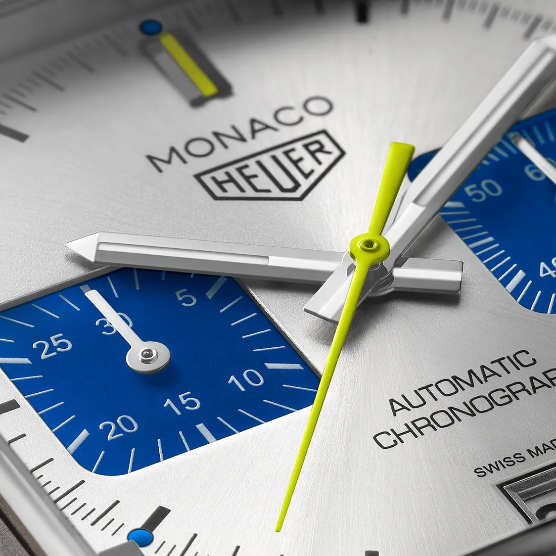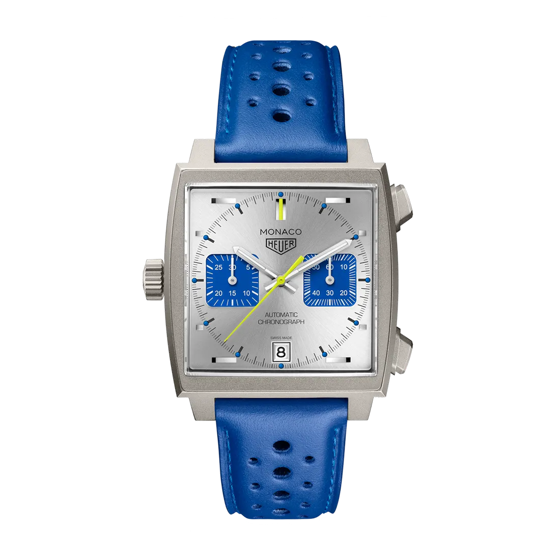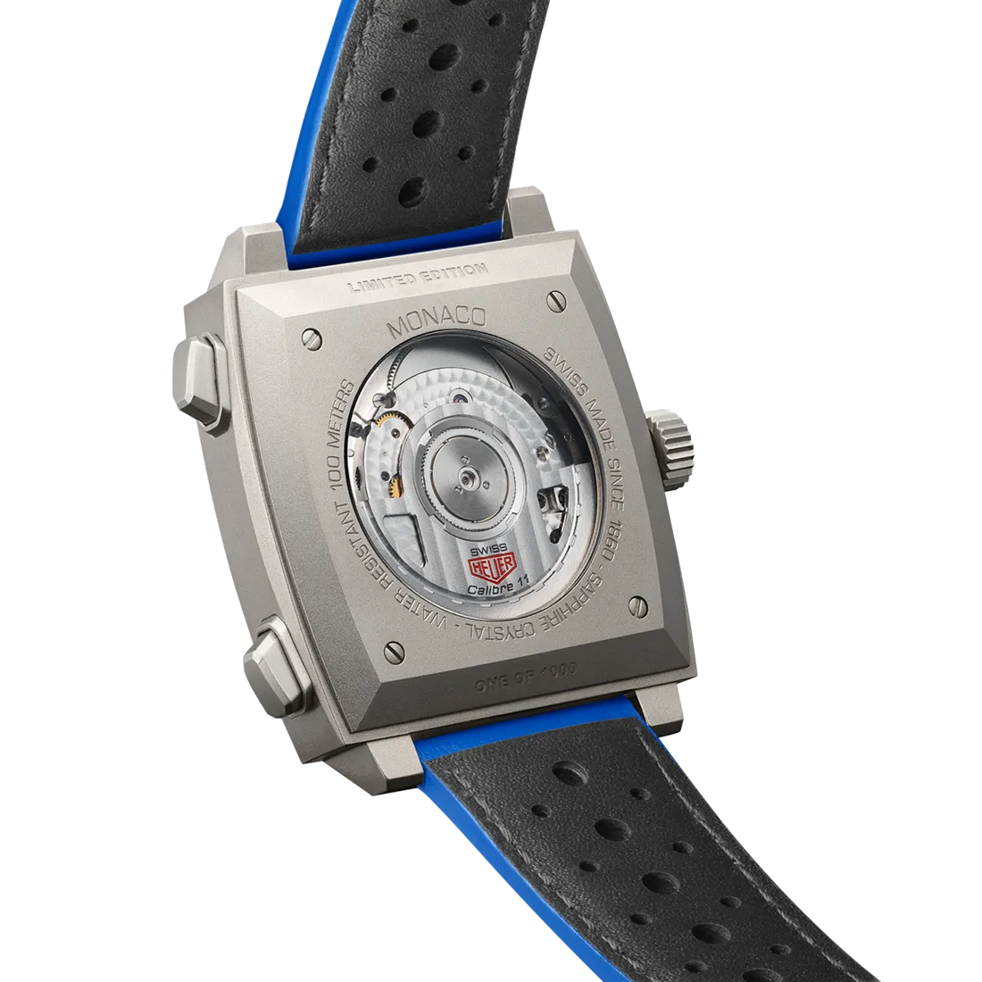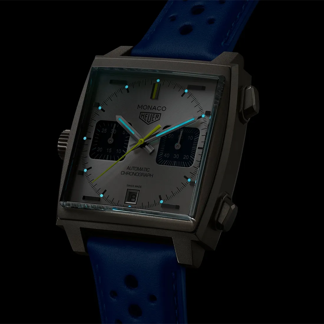ブルーのカラーコードで挑戦的なクールさを感じさせるタグ・ホイヤー モナコ クロノグラフ レーシングブルーのデザインは、フランスのドライバーたちがライバルに立ち向かうためにこの色を身に着けた、モーターレーシングの歴史を思わせます。限定1000本のモデル